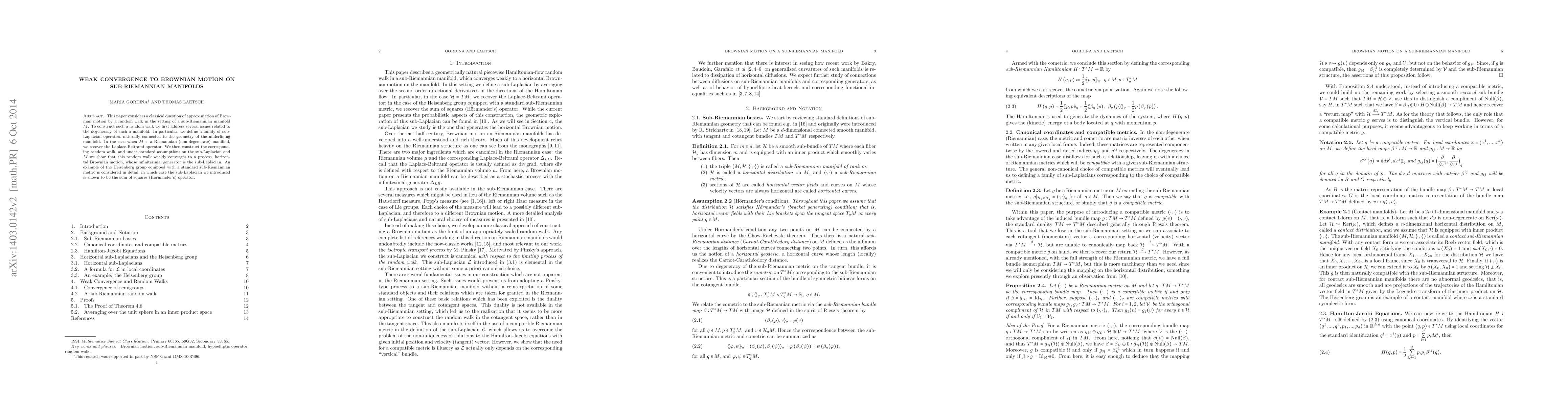 This paper studies the weak convergence of a random walk to horizontal Brownian motion on sub-Riemannian manifolds, addressing the manifold's geometric degeneracy through the construction of sub-Laplacian operators, and demonstrates the convergence in the case of the Heisenberg group.