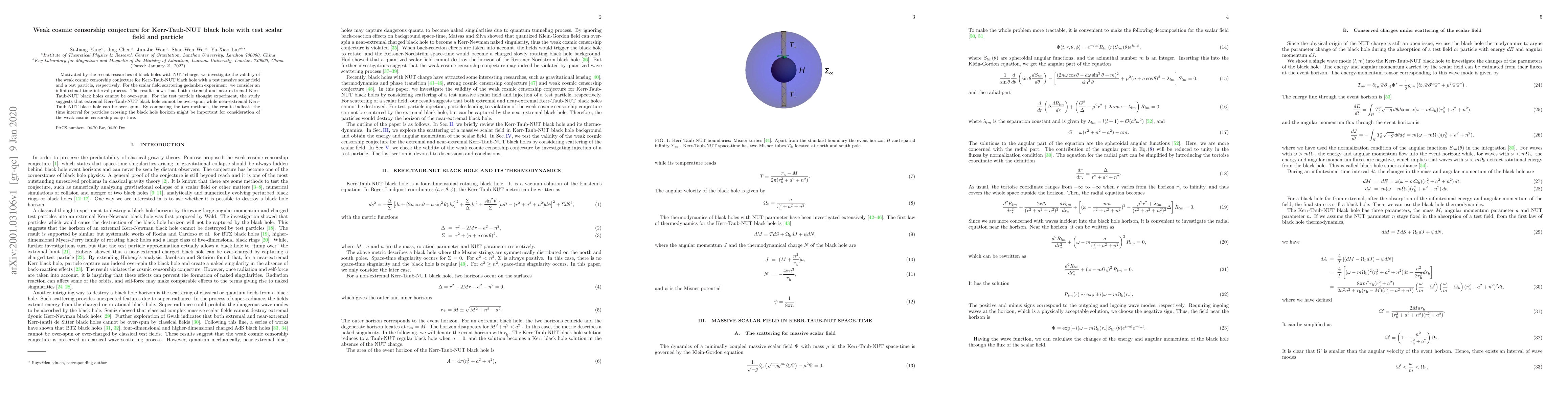 This paper examines the weak cosmic censorship conjecture for Kerr-Taub-NUT black holes with test massive scalar fields and particles. Results show that while extremal and near-extremal black holes cannot be over-spun by scalar fields, near-extremal black holes can be over-spun by particles, highlighting the significance of the time interval for particle interactions.