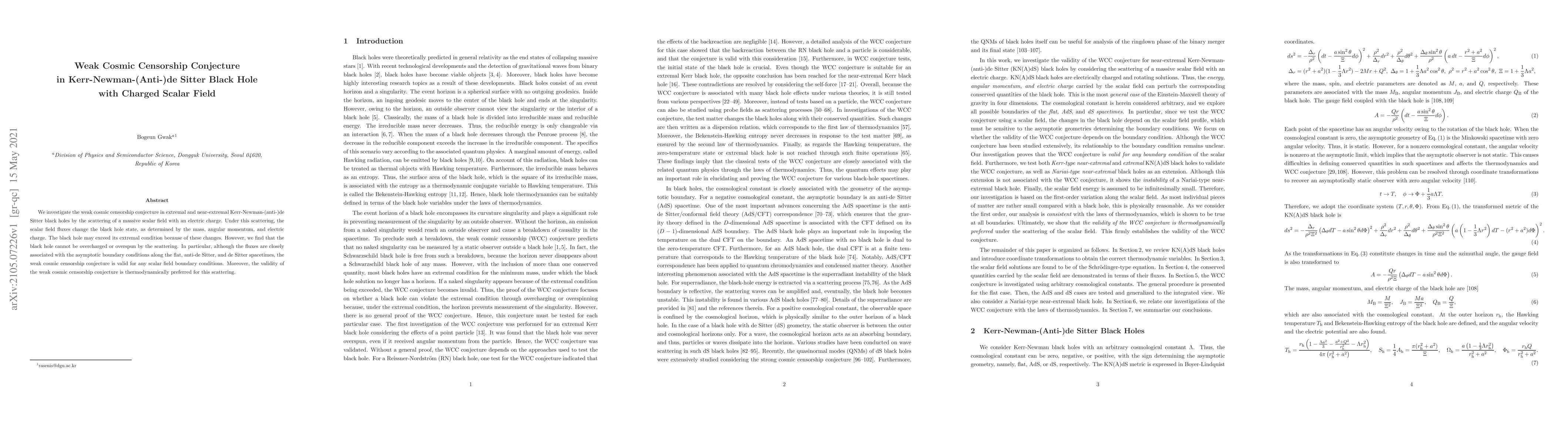 We investigate the weak cosmic censorship conjecture in extremal and near-extremal Kerr-Newman-(anti-)de Sitter black holes by the scattering of a massive scalar field with an electric charge. Under this scattering, the scalar field fluxes change the black hole state, as determined by the mass, angular momentum, and electric charge. The black hole may exceed its extremal condition because of these changes. However, we find that the black hole cannot be overcharged or overspun by the scattering. In particular, although the fluxes are closely associated with the asymptotic boundary conditions along the flat, anti-de Sitter, and de Sitter spacetimes, the weak cosmic censorship conjecture is valid for any scalar field boundary conditions. Moreover, the validity of the weak cosmic censorship conjecture is thermodynamically preferred for this scattering.