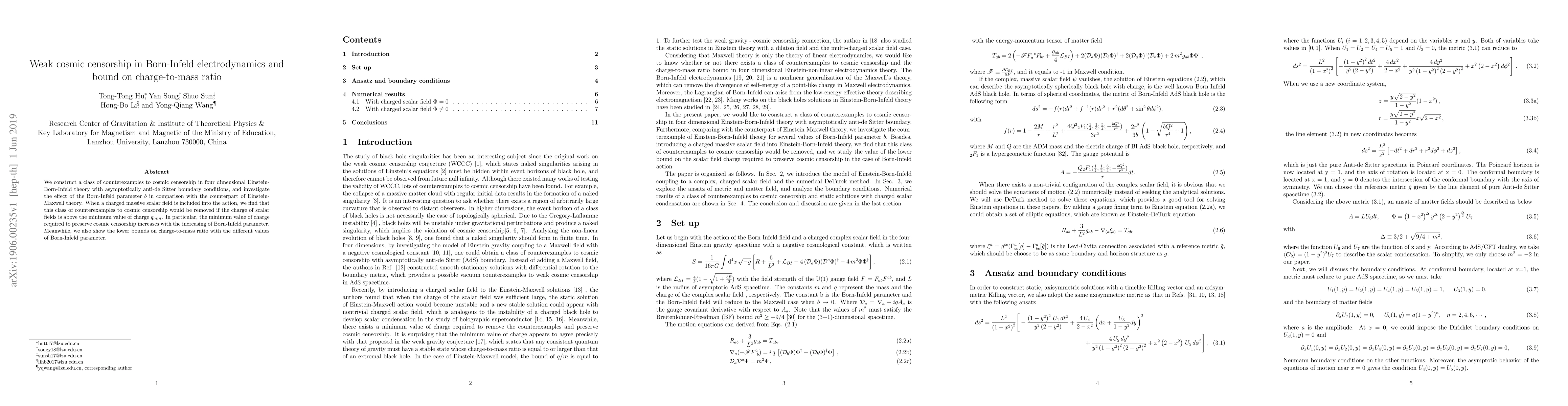 We construct a class of counterexamples to cosmic censorship in four dimensional Einstein-Born-Infeld theory with asymptotically anti-de Sitter boundary conditions, and investigate the effect of the Born-Infeld parameter $b$ in comparison with the counterpart of Einstein-Maxwell theory. When a charged massive scalar field is included into the action, we find that this class of counterexamples to cosmic censorship would be removed if the charge of scalar fields is above the minimum value of charge $q_{min}$. In particular, the minimum value of charge required to preserve cosmic censorship increases with the increasing of Born-Infeld parameter. Meanwhile, we also show the lower bounds on charge-to-mass ratio with the different values of Born-Infeld parameter.