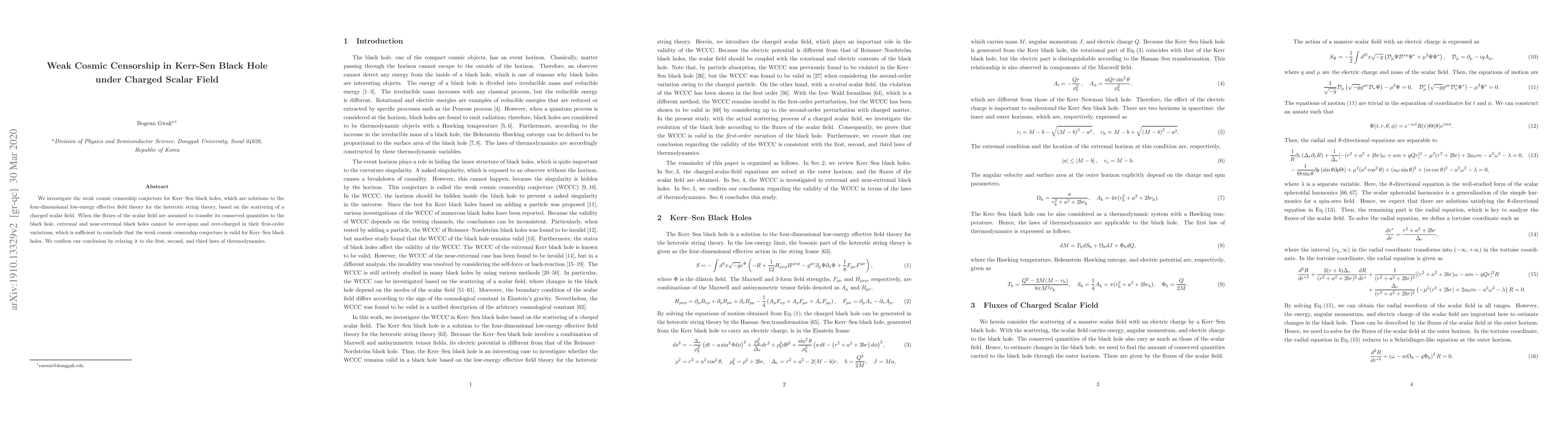 This study confirms the weak cosmic censorship conjecture for Kerr-Sen black holes by analyzing the scattering of a charged scalar field, demonstrating that extremal and near-extremal black holes cannot be over-spun or over-charged, and relates the findings to thermodynamic laws.