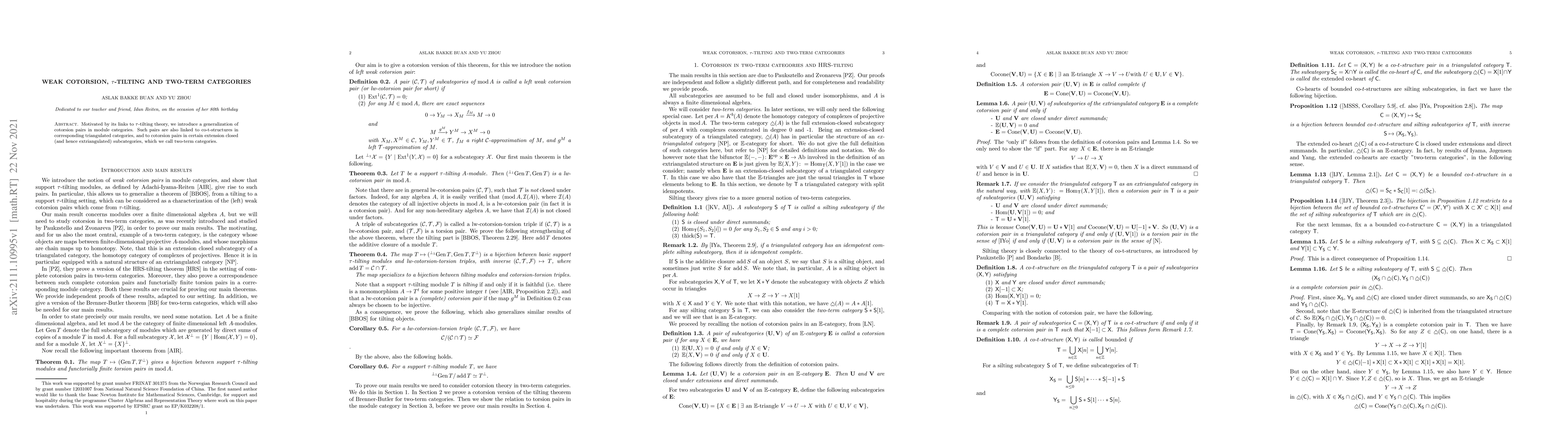 This paper generalizes cotorsion pairs in module categories, linking them to $\tau$-tilting theory and co-t-structures in triangulated categories, and defines two-term categories as extension closed subcategories that retain these cotorsion pair properties.