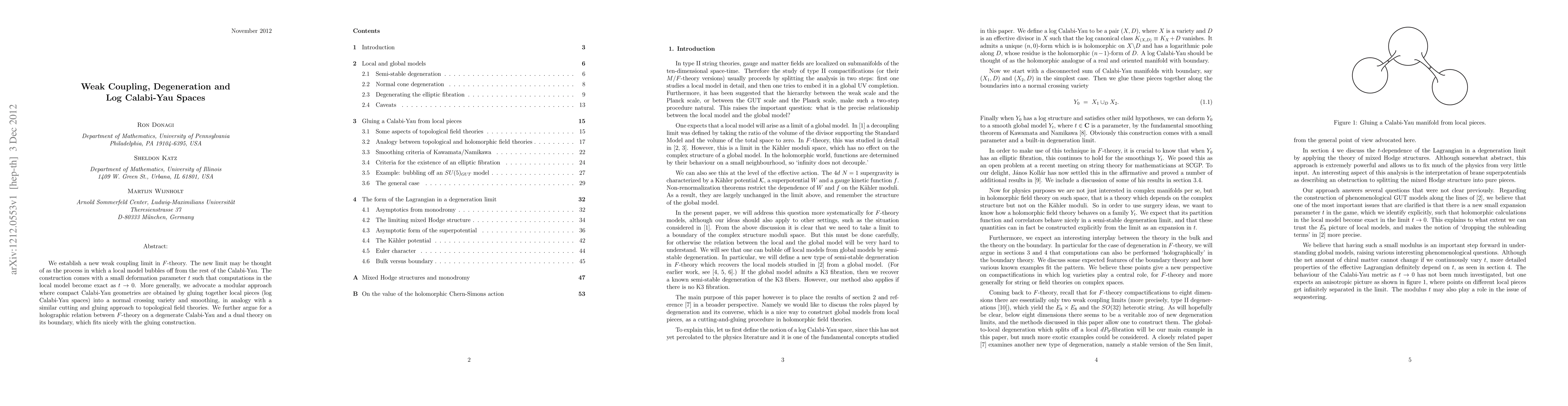 Researchers introduce a new weak coupling limit in F-theory, proposing a modular approach to construct compact Calabi-Yau geometries from local log Calabi-Yau spaces, and suggest a holographic relation between F-theory on degenerate Calabi-Yaus and dual theories on their boundaries.