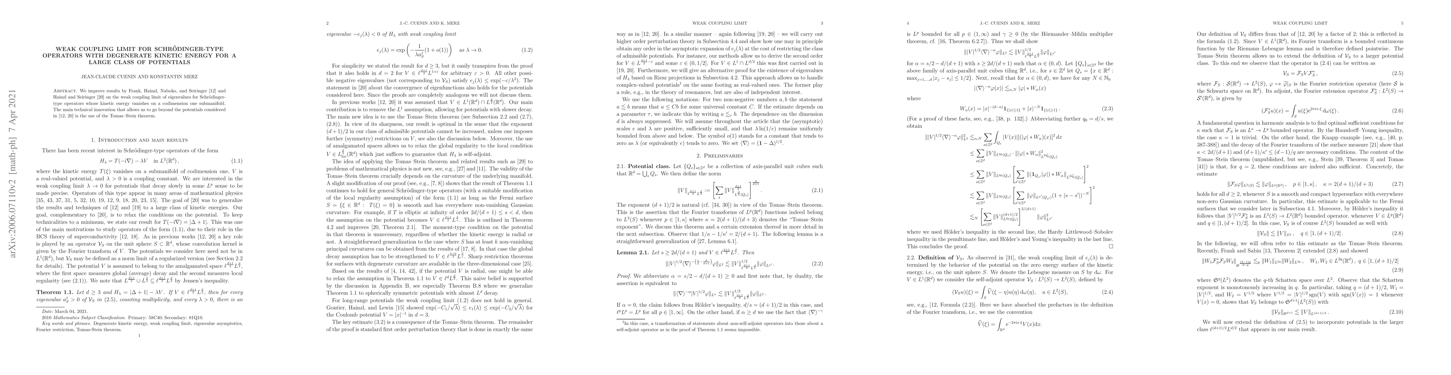We improve results by Frank, Hainzl, Naboko, and Seiringer [12] and Hainzl and Seiringer [20] on the weak coupling limit of eigenvalues for Schr\"odinger-type operators whose kinetic energy vanishes on a codimension one submanifold. The main technical innovation that allows us to go beyond the potentials considered in [12, 20] is the use of the Tomas-Stein theorem.