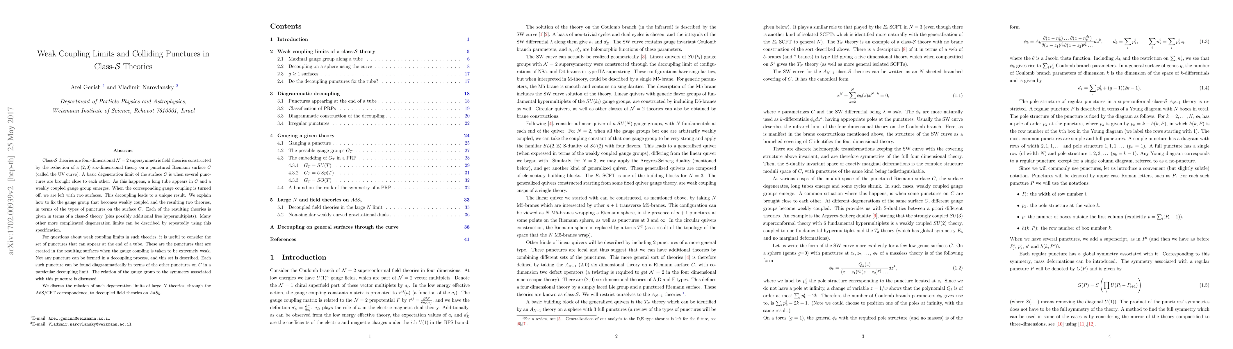 Class-S theories are four-dimensional N=2 supersymmetric field theories constructed by the reduction of a (2,0) six-dimensional theory on a punctured Riemann surface C (called the UV curve). A basic degeneration limit of the surface C is when several punctures are brought close to each other. As this happens, a long tube appears in C and a weakly coupled gauge group emerges. When the corresponding gauge coupling is turned off, we are left with two surfaces. This decoupling leads to a unique result. We explain how to fix the gauge group that becomes weakly coupled and the resulting two theories, in terms of the types of punctures on the surface C. Each of the resulting theories is given in terms of a class-S theory (plus possibly additional free hypermultiplets). Many other more complicated degeneration limits can be described by repeatedly using this specification. For questions about weak coupling limits in such theories, it is useful to consider the set of punctures that can appear at the end of a tube. These are the punctures that are created in the resulting surfaces when the gauge coupling is taken to be extremely weak. Not any puncture can be formed in a decoupling process, and this set is described. Each such puncture can be found diagrammatically in terms of the other punctures on C in a particular decoupling limit. The relation of the gauge group to the symmetry associated with this puncture is discussed. We discuss the relation of such degeneration limits of large N theories, through the AdS/CFT correspondence, to decoupled field theories on AdS_5.