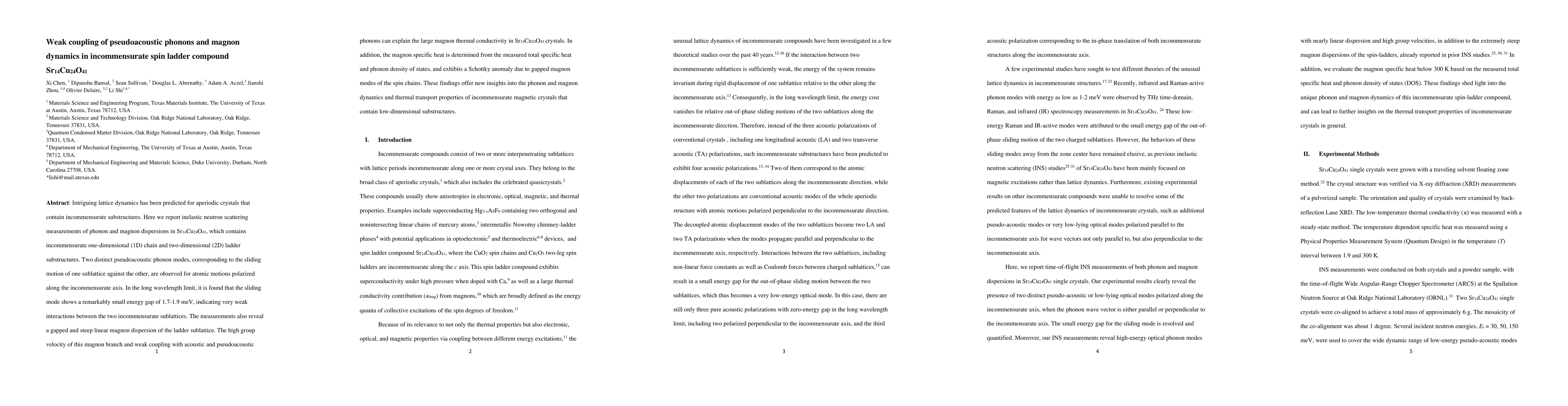 Intriguing lattice dynamics has been predicted for aperiodic crystals that contain incommensurate substructures. Here we report inelastic neutron scattering measurements of phonon and magnon dispersions in Sr14Cu24O41, which contains incommensurate one-dimensional (1D) chain and two-dimensional (2D) ladder substructures. Two distinct pseudoacoustic phonon modes, corresponding to the sliding motion of one sublattice against the other, are observed for atomic motions polarized along the incommensurate axis. In the long wavelength limit, it is found that the sliding mode shows a remarkably small energy gap of 1.7-1.9 meV, indicating very weak interactions between the two incommensurate sublattices. The measurements also reveal a gapped and steep linear magnon dispersion of the ladder sublattice. The high group velocity of this magnon branch and weak coupling with acoustic and pseudoacoustic phonons can explain the large magnon thermal conductivity in Sr14Cu24O41 crystals. In addition, the magnon specific heat is determined from the measured total specific heat and phonon density of states, and exhibits a Schottky anomaly due to gapped magnon modes of the spin chains. These findings offer new insights into the phonon and magnon dynamics and thermal transport properties of incommensurate magnetic crystals that contain low-dimensional substructures.
