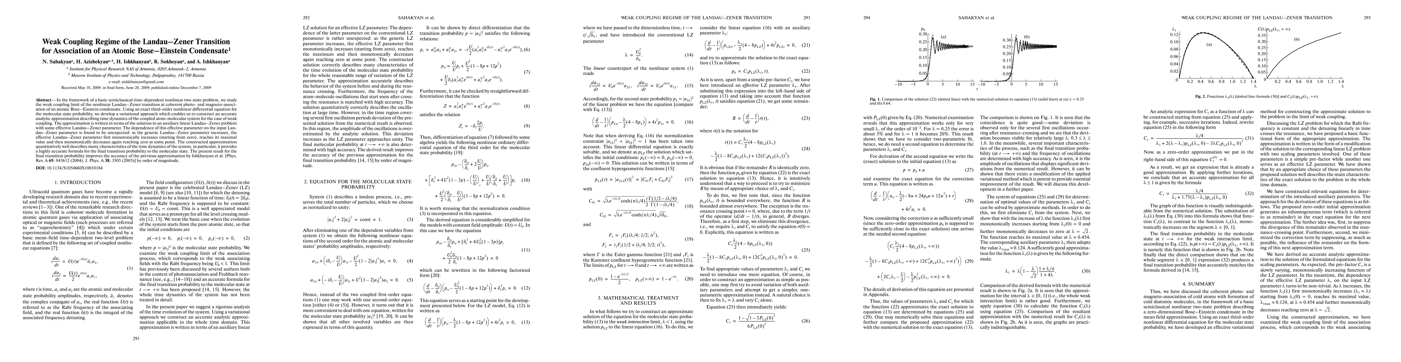 This paper explores the weak coupling regime of the Landau-Zener transition in the association of an atomic Bose-Einstein condensate, developing a variational approach to accurately describe the time dynamics of the coupled atom-molecular system. The study reveals an unexpected dependence of the effective Landau-Zener parameter, significantly improving the accuracy of the final transition probability to the molecular state compared to previous methods.