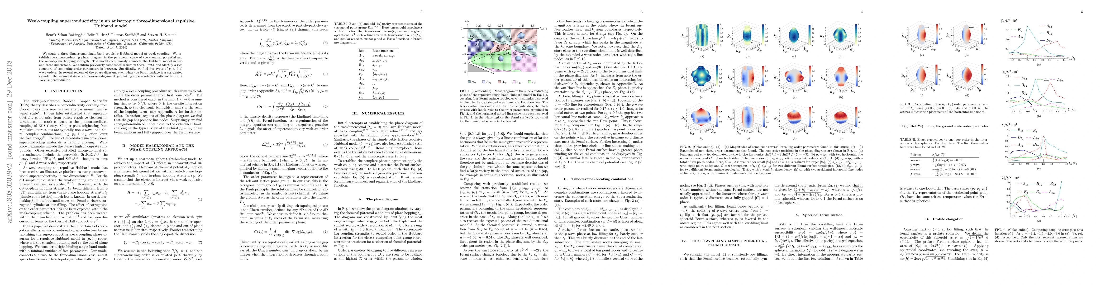 We study a three-dimensional single-band repulsive Hubbard model at weak coupling. We establish the superconducting phase diagram in the parameter space of the chemical potential and the out-of-plane hopping strength. The model continuously connects the Hubbard model in two and three dimensions. We confirm previously-established results in these limits, and identify a rich structure of competing order parameters in between. Specifically, we find five types of $p$- and $d$-wave orders. In several regions of the phase diagram, even when the Fermi surface is a corrugated cylinder, the ground state is a time-reversal-symmetry-breaking superconductor with nodes, i.e. a Weyl superconductor.