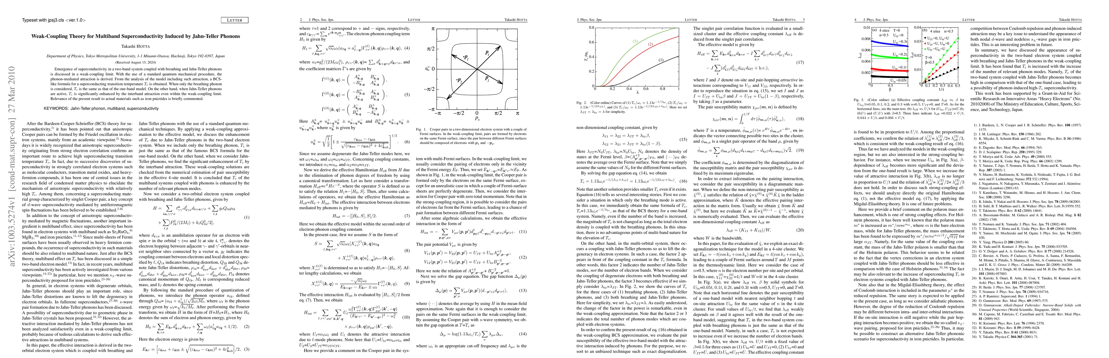 This paper explores superconductivity in a two-band system mediated by Jahn-Teller and breathing phonons in a weak-coupling framework, deriving a BCS-like formula for the transition temperature $T_{\rm c}$. The study finds that $T_{\rm c}$ is enhanced by interband attraction when Jahn-Teller phonons are involved, with implications for materials like iron pnictides.