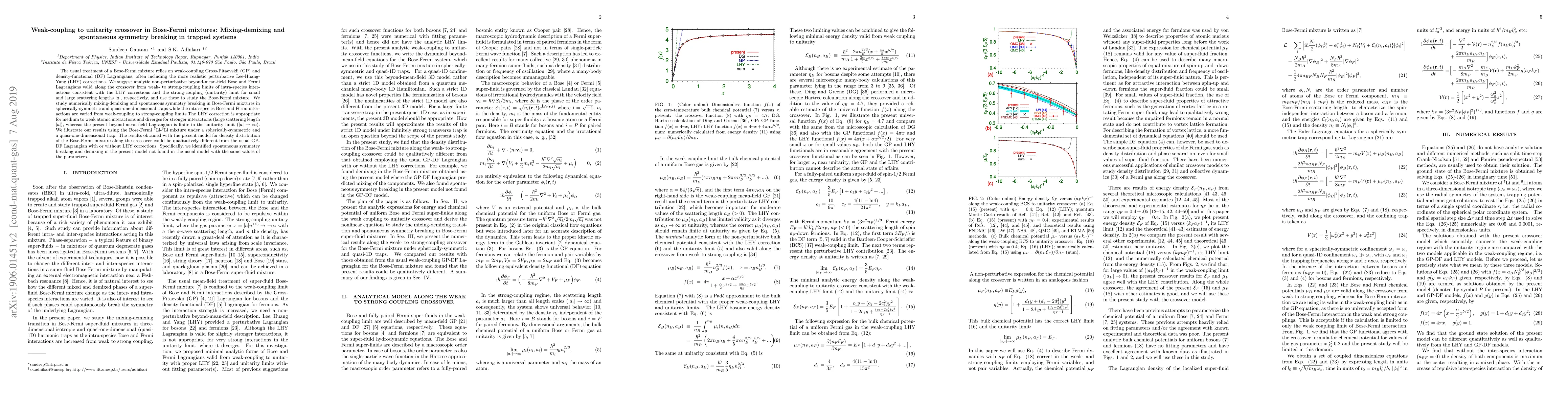 The usual treatment of a Bose-Fermi mixture relies on weak-coupling Gross-Pitaevskii (GP) and density-functional (DF) Lagrangians, often including the more realistic {perturbative} Lee-Huang-Yang (LHY) corrections. We suggest analytic {non-perturbative} beyond-mean-field Bose and Fermi Lagrangians valid along the crossover from weak- to strong-coupling limits of intra-species interactions consistent with the LHY corrections and the strong-coupling (unitarity) limit for small and large scattering lengths $|a|$, respectively, and use these to study the Bose-Fermi mixture. We study numerically mixing-demixing and spontaneous symmetry breaking in Bose-Fermi mixtures in spherically-symmetric and quasi-one-dimensional traps while the intra-species Bose and Fermi interactions are varied from weak-coupling to strong-coupling limits.The LHY correction is appropriate for medium to weak atomic interactions and diverges for stronger interactions (large scattering length $|a|$), whereas the present beyond-mean-field Lagrangian is finite in the unitarity limit ($|a|\to \infty$). We illustrate our results using the Bose-Fermi $^7$Li-$^6$Li mixture under a spherically-symmetric and a quasi-one-dimensional trap. The results obtained with the present model for density distribution of the Bose-Fermi mixture along the crossover could be qualitatively different from the usual GP-DF Lagrangian with or without LHY corrections. Specifically, we identified spontaneous symmetry breaking and demixing in the present model not found in the usual model with the same values of the parameters.
