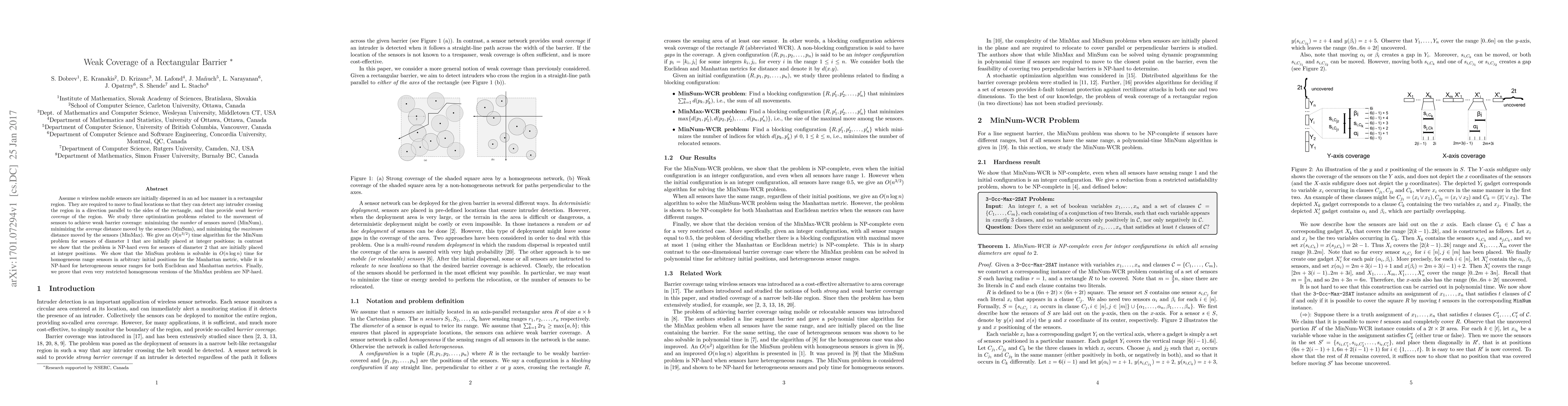 This paper investigates optimization problems for wireless mobile sensors to achieve weak barrier coverage in a rectangular region, focusing on minimizing sensor movement. It presents efficient algorithms for specific cases and proves NP-hardness for others, including the MinNum, MinSum, and MinMax problems.