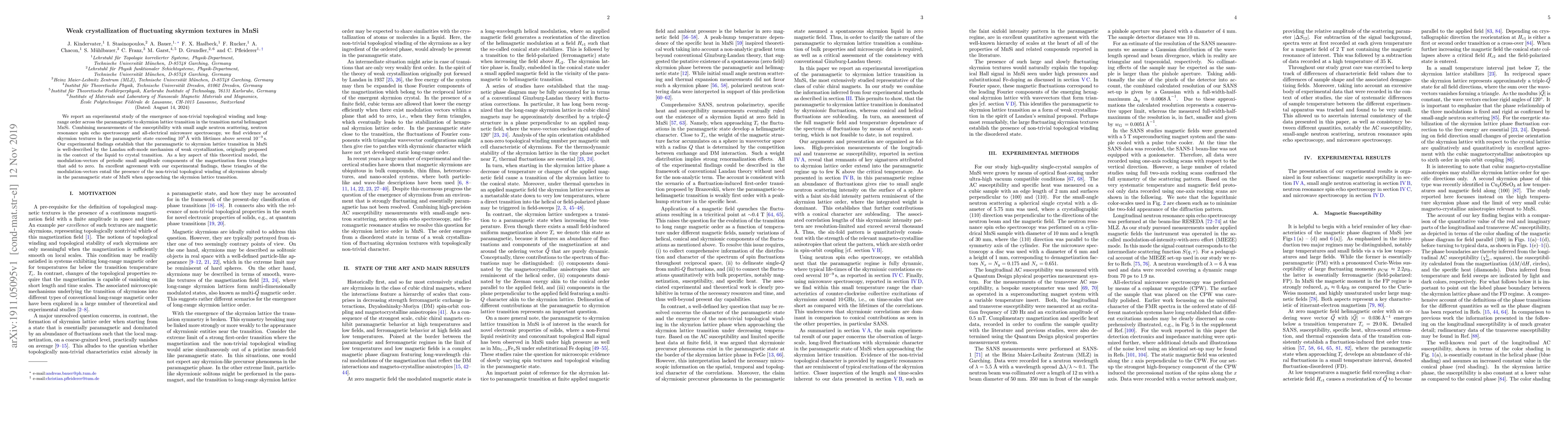 We report an experimental study of the emergence of non-trivial topological winding and long-range order across the paramagnetic to skyrmion lattice transition in the transition metal helimagnet MnSi. Combining measurements of the susceptibility with small angle neutron scattering, neutron resonance spin echo spectroscopy and all-electrical microwave spectroscopy, we find evidence of skyrmion textures in the paramagnetic state exceeding $10^3$\AA with lifetimes above several 10$^{-9}$s. Our experimental findings establish that the paramagnetic to skyrmion lattice transition in MnSi is well-described by the Landau soft-mode mechanism of weak crystallization, originally proposed in the context of the liquid to crystal transition. As a key aspect of this theoretical model, the modulation-vectors of periodic small amplitude components of the magnetization form triangles that add to zero. In excellent agreement with our experimental findings, these triangles of the modulation-vectors entail the presence of the non-trivial topological winding of skyrmions already in the paramagnetic state of MnSi when approaching the skyrmion lattice transition.