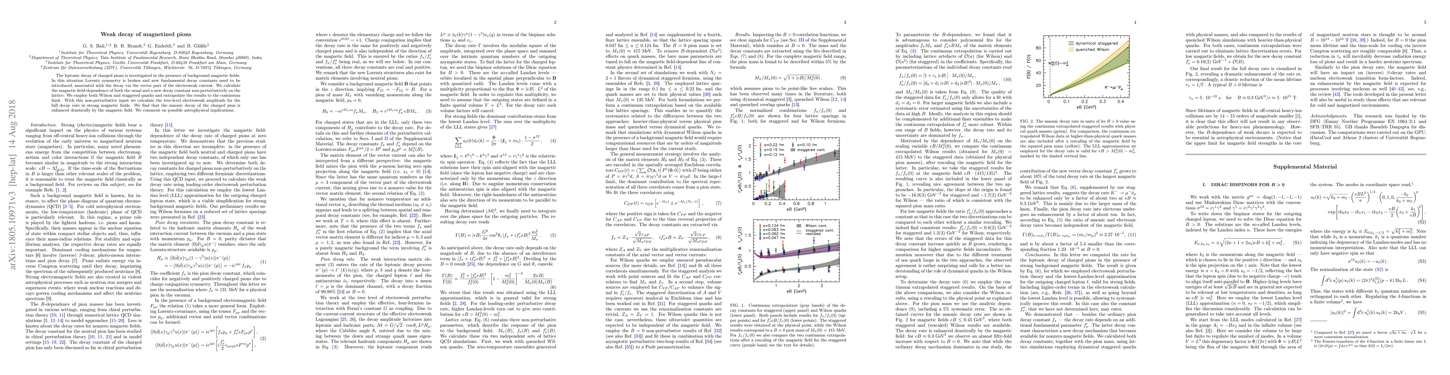 The leptonic decay of charged pions is investigated in the presence of background magnetic fields. In this situation Lorentz symmetry is broken and new fundamental decay constants need to be introduced, associated with the decay via the vector part of the electroweak current. We calculate the magnetic field-dependence of both the usual and a new decay constant non-perturbatively on the lattice. We employ both Wilson and staggered quarks and extrapolate the results to the continuum limit. With this non-perturbative input we calculate the tree-level electroweak amplitude for the full decay rate in strong magnetic fields. We find that the muonic decay of the charged pion is enhanced drastically by the magnetic field. We comment on possible astrophysical implications.