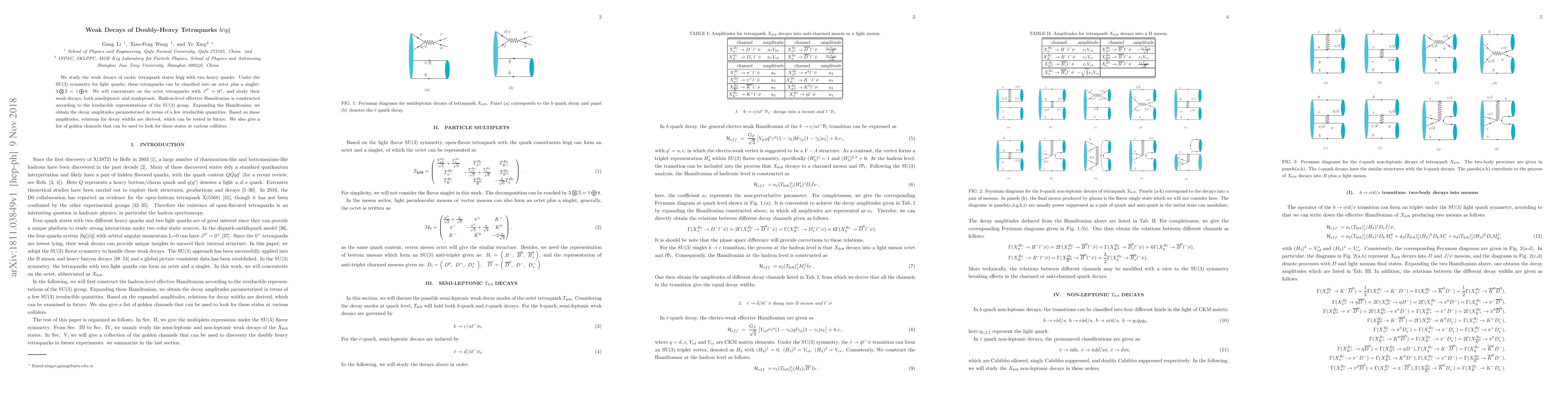 We study the weak decays of exotic tetraquark states ${b\bar c}{q\bar q}$ with two heavy quarks. Under the SU(3) symmetry for light quarks, these tetraquarks can be classified into an octet plus a singlet: $3\bigotimes\bar 3=1\bigoplus8$. We will concentrate on the octet tetraquarks with $J^{P}=0^{+}$, and study their weak decays, both semileptonic and nonleptonic. Hadron-level effective Hamiltonian is constructed according to the irreducible representations of the SU(3) group. Expanding the Hamiltonian, we obtain the decay amplitudes parameterized in terms of a few irreducible quantities. Based on these amplitudes, relations for decay widths are derived, which can be tested in future. We also give a list of golden channels that can be used to look for these states at various colliders.