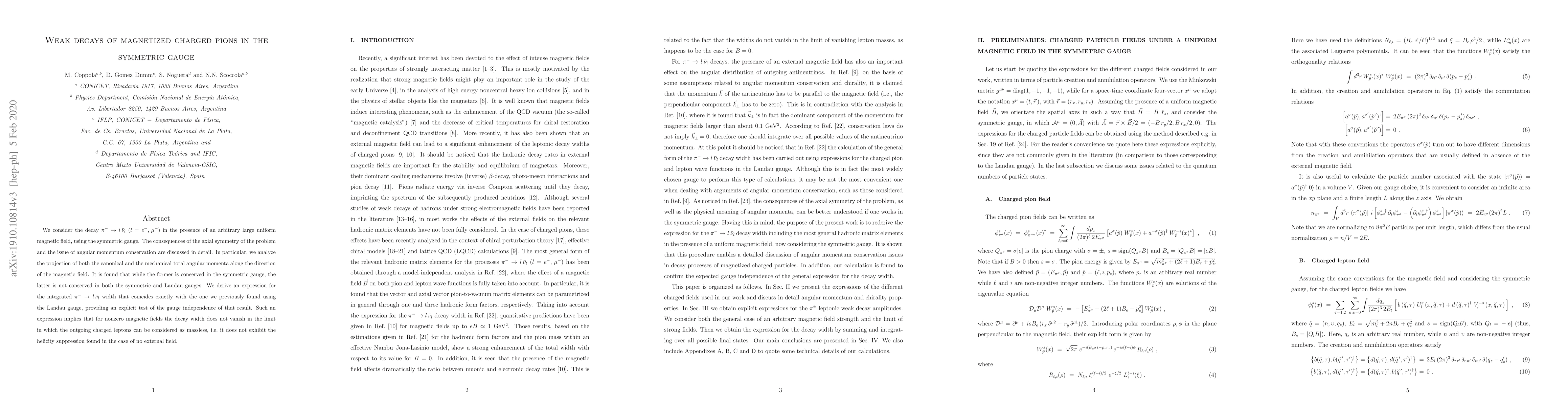 We consider the decay $\pi^- \to l \, \bar{\nu}_l$ ($l=e^-,\,\mu^-$) in the presence of an arbitrary large uniform magnetic field, using the symmetric gauge. The consequences of the axial symmetry of the problem and the issue of angular momentum conservation are discussed in detail. In particular, we analyze the projection of both the canonical and the mechanical total angular momenta along the direction of the magnetic field. It is found that while the former is conserved in the symmetric gauge, the latter is not conserved in both the symmetric and Landau gauges. We derive an expression for the integrated $\pi^- \to l \, \bar{\nu}_l$ width that coincides exactly with the one we previously found using the Landau gauge, providing an explicit test of the gauge independence of that result. Such an expression implies that for nonzero magnetic fields the decay width does not vanish in the limit in which the outgoing charged leptons can be considered as massless, i.e. it does not exhibit the helicity suppression found in the case of no external field.