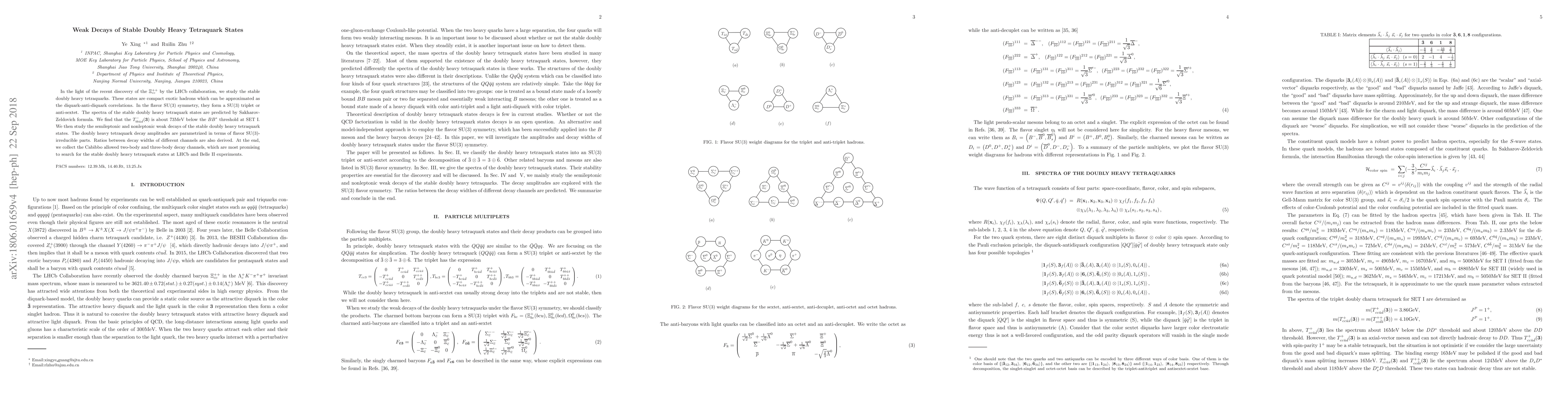 In the light of the recent discovery of the $\Xi^{++}_{cc}$ by LHCb collaboration, we study the stable doubly heavy tetraquarks. These states are compact exotic hadrons which can be approximated as the diquark-anti-diquark correlations. In the flavor SU(3) symmetry, they form an SU(3) triplet or anti-sextet. The spectra of the stable doubly heavy tetraquark states are predicted by Sakharov-Zeldovich formula. We find that the $T^+_{cc\bar{u}\bar{d}}({\bf 3})$ is about 16MeV below the $DD^*$ threshold, while $T^{-}_{bb\bar{u}\bar{d}}({\bf 3})$ is about 73MeV below the $BB^*$ threshold. We then study the semileptonic and nonleptonic weak decays of the stable doubly heavy tetraquark states. The decay amplitudes are parametrized in terms of SU(3)-irreducible amplitudes. Ratios between decay widths of different channels are also derived. At the end, we collect the Cabibbo allowed two-body and three-body decay channels, which are most promising to search for the stable doubly heavy tetraquark states at LHCb and Belle II experiments.
