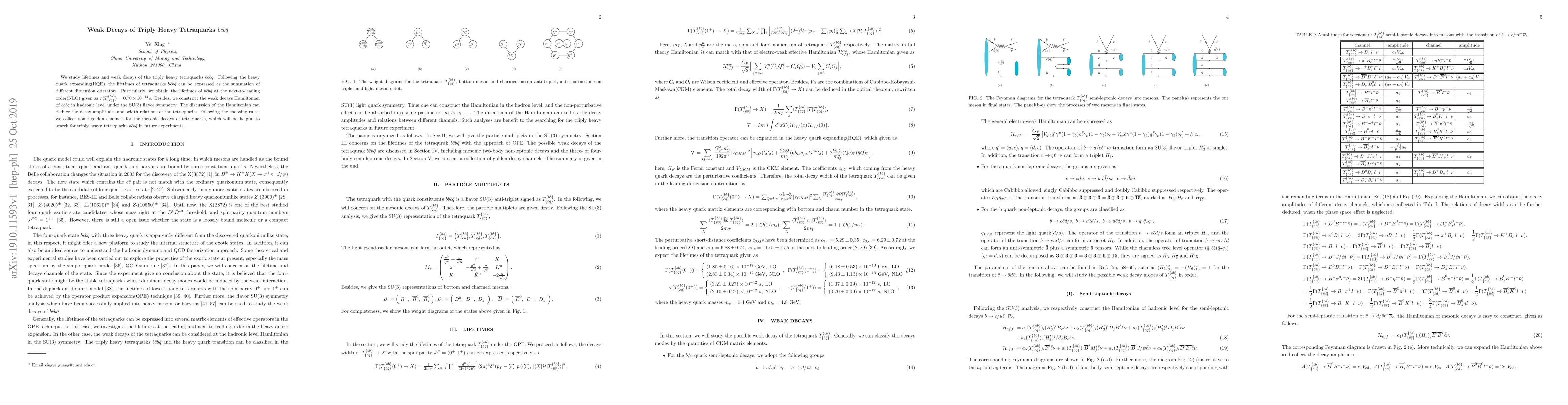 We study lifetimes and weak decays of the triply heavy tetraquarks ${b\bar c}{b\bar q}$. Following the heavy quark expanding(HQE), the lifetimes of tetraquarks ${b\bar c}{b\bar q}$ can be expressed as the summation of different dimension operators. Particularly, we obtain the lifetimes of ${b\bar c}{b\bar q}$ at the next-to-leading order(NLO) given as $\tau(T^{\{bb\}}_{\{\bar c\bar q\}})=0.70\times 10^{-12}s$. Besides, we construct the weak decays Hamiltonian of ${b\bar c}{b\bar q}$ in hadronic level under the SU(3) flavor symmetry. The discussion of the Hamiltonian can deduce the decay amplitudes and width relations of the tetraquarks. Following the choosing rules, we collect some golden channels for the mesonic decays of tetraquarks, which will be helpful to search for triply heavy tetraquarks ${b\bar c}{b\bar q}$ in future experiments.
