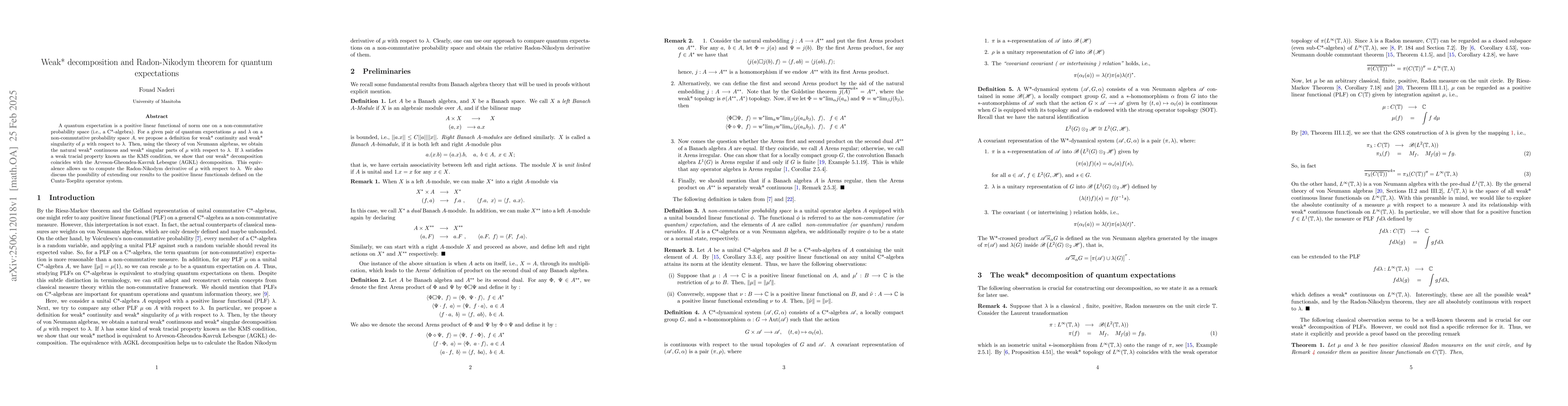 A quantum expectation is a positive linear functional of norm one on a non-commutative probability space (i.e., a C*-algebra). For a given pair of quantum expectations $\mu$ and $\lambda$ on a non-commutative probability space $A$, we propose a definition for weak* continuity and weak* singularity of $\mu$ with respect to $\lambda$. Then, using the theory of von Neumann algebras, we obtain the natural weak* continuous and weak* singular parts of $\mu$ with respect to $\lambda$. If $\lambda$ satisfies a weak tracial property known as the KMS condition, we show that our weak* decomposition coincides with the Arveson-Gheondea-Kavruk Lebesgue (AGKL) decomposition. This equivalence allows us to compute the Radon-Nikodym derivative of $\mu$ with respect to $\lambda$. We also discuss the possibility of extending our results to the positive linear functionals defined on the Cuntz-Toeplitz operator system.