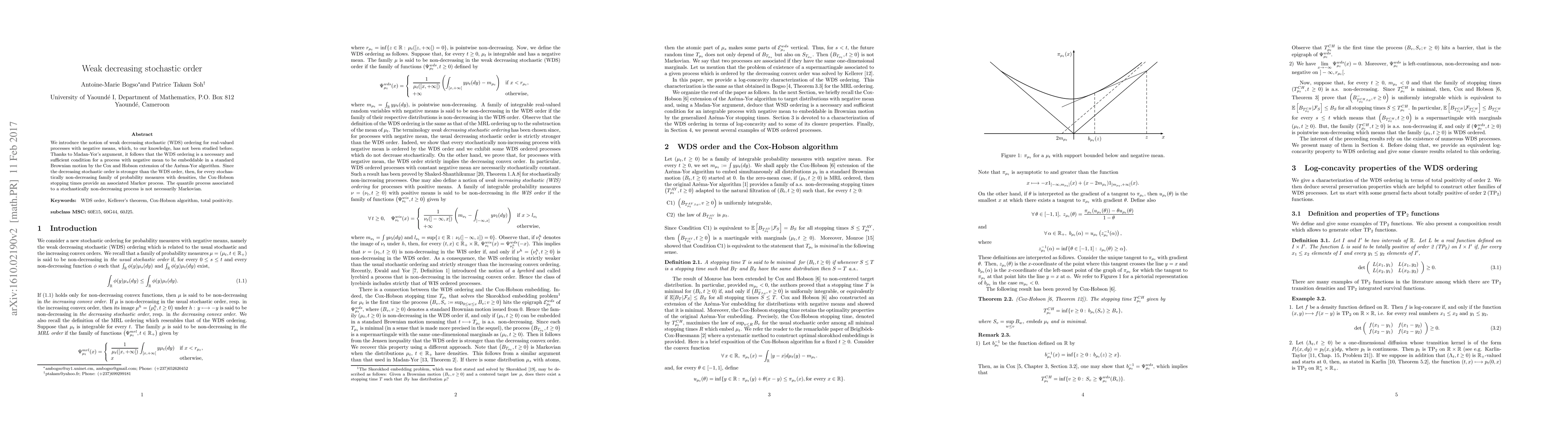 We introduce the notion of weak decreasing stochastic (WDS) ordering for real-valued processes with negative means, which, to our knowledge, has not been studied before. Thanks to Madan-Yor's argument, it follows that the WDS ordering is a necessary and sufficient condition for a process with negative mean to be embeddable in a standard Brownian motion by the Cox and Hobson extension of the Az\'ema-Yor algorithm. Since the decreasing stochastic order is stronger than the WDS order, then, for every stochastically non-decreasing family of probability measures with densities, the Cox-Hobson stopping times provide an associated Markov process. The quantile process associated to a stochastically non-decreasing process is not necessarily Markovian.