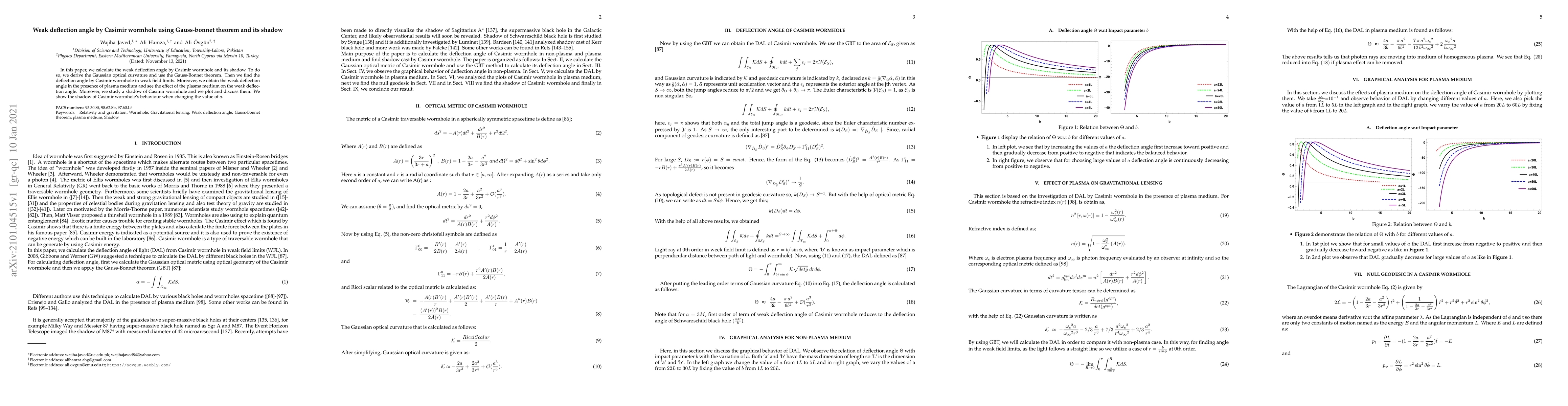 This paper calculates the weak deflection angle by a Casimir wormhole using the Gauss-Bonnet theorem and explores its shadow. It also examines the influence of a plasma medium on the deflection angle and analyzes the shadow's behavior with varying parameters.