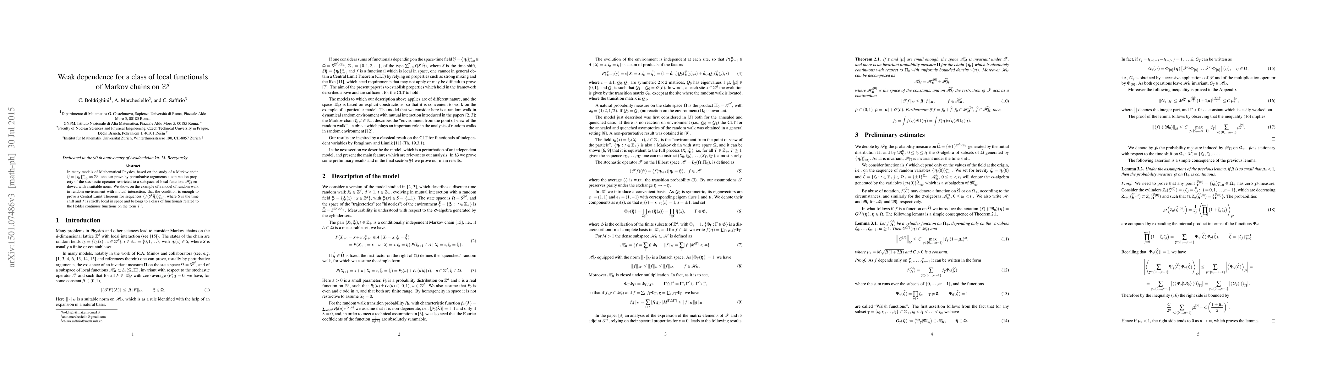 In some papers on infinite Markov chains in $\mathbb{Z}^d$, and notably in the work of R.A. Minlos and collaborators, one can prove the existence of a spectral gap for a suitable subspace of local functions. We consider functions of the type $f(\widehat \eta)$, where $\widehat \eta= \{\eta_{t}\}_{t=0}^{\infty}$ is the sequence of the states, and $f$ is local. In the case of a simple example of random walk in random environment with mutual interaction we show that there is a natural class of functions $f$, related to the H\"older continuos functions $\mathcal C^{\alpha}$on the torus $T^{1}$, with $\alpha\in (0,1)$ large enough, depending on the spectral gap, for which the Central Limit Theorem holds for the sequence $f(S^{k}\widehat \eta)$, $k=0,1,\ldots$, where $S$ is the time shift.