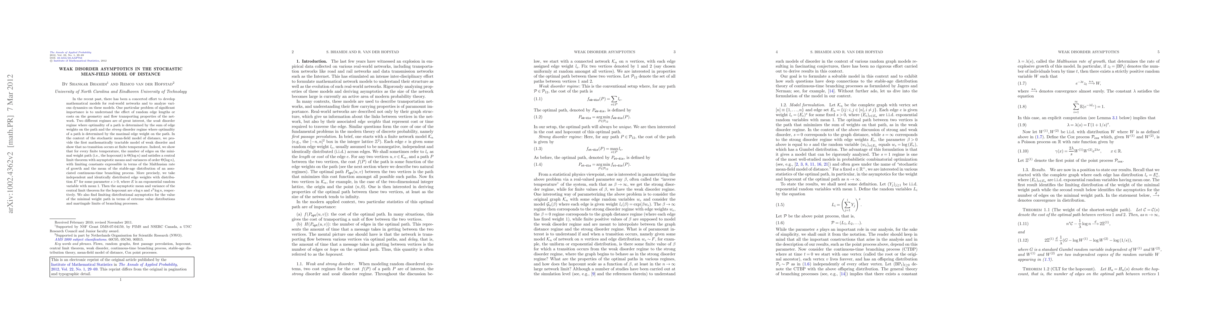 In the recent past, there has been a concerted effort to develop mathematical models for real-world networks and to analyze various dynamics on these models. One particular problem of significant importance is to understand the effect of random edge lengths or costs on the geometry and flow transporting properties of the network. Two different regimes are of great interest, the weak disorder regime where optimality of a path is determined by the sum of edge weights on the path and the strong disorder regime where optimality of a path is determined by the maximal edge weight on the path. In the context of the stochastic mean-field model of distance, we provide the first mathematically tractable model of weak disorder and show that no transition occurs at finite temperature. Indeed, we show that for every finite temperature, the number of edges on the minimal weight path (i.e., the hopcount) is $\Theta(\log{n})$ and satisfies a central limit theorem with asymptotic means and variances of order $\Theta(\log{n})$, with limiting constants expressible in terms of the Malthusian rate of growth and the mean of the stable-age distribution of an associated continuous-time branching process. More precisely, we take independent and identically distributed edge weights with distribution $E^s$ for some parameter $s>0$, where $E$ is an exponential random variable with mean 1. Then the asymptotic mean and variance of the central limit theorem for the hopcount are $s\log{n}$ and $s^2\log{n}$, respectively. We also find limiting distributional asymptotics for the value of the minimal weight path in terms of extreme value distributions and martingale limits of branching processes.