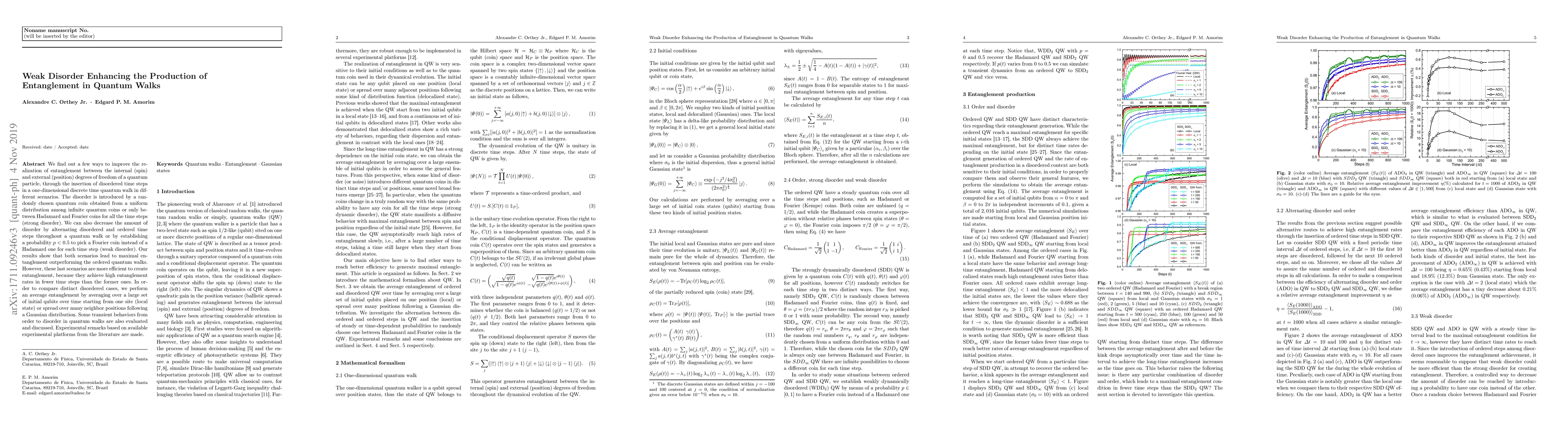 This paper explores how weak disorder enhances entanglement in quantum walks by introducing random quantum coins, showing that disordered time steps can outperform ordered walks in generating maximal entanglement, albeit more efficiently through specific strategies. The study also evaluates transient behaviors and compares different disordered scenarios experimentally.