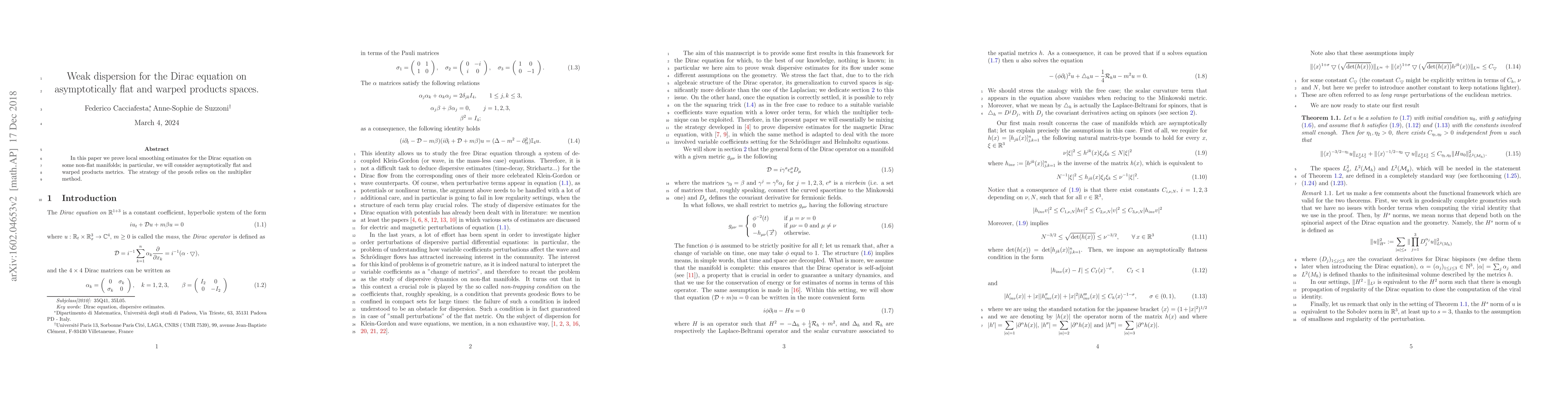 We prove local smoothing estimates for the Dirac equation on some non-flat manifolds; in particular, we will consider asymptotically flat and warped products metrics. The strategy of the proofs relies on the multiplier method.