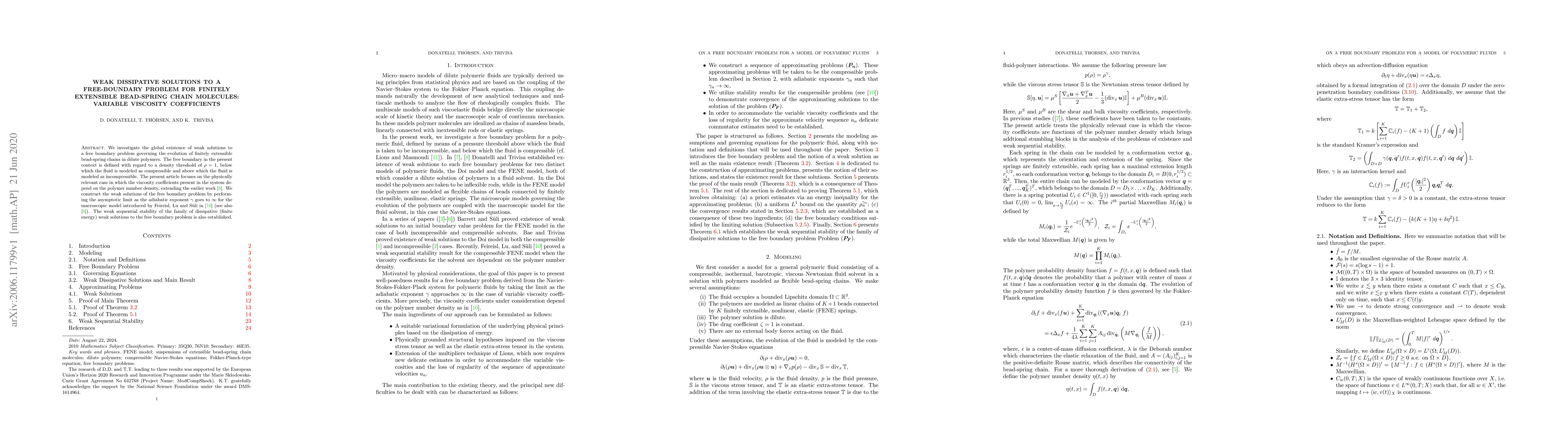 This paper investigates the global existence of weak dissipative solutions to a free boundary problem for finitely extensible bead-spring chain molecules, focusing on variable viscosity coefficients dependent on polymer density. The authors construct these solutions by taking the asymptotic limit as the adiabatic exponent approaches infinity.