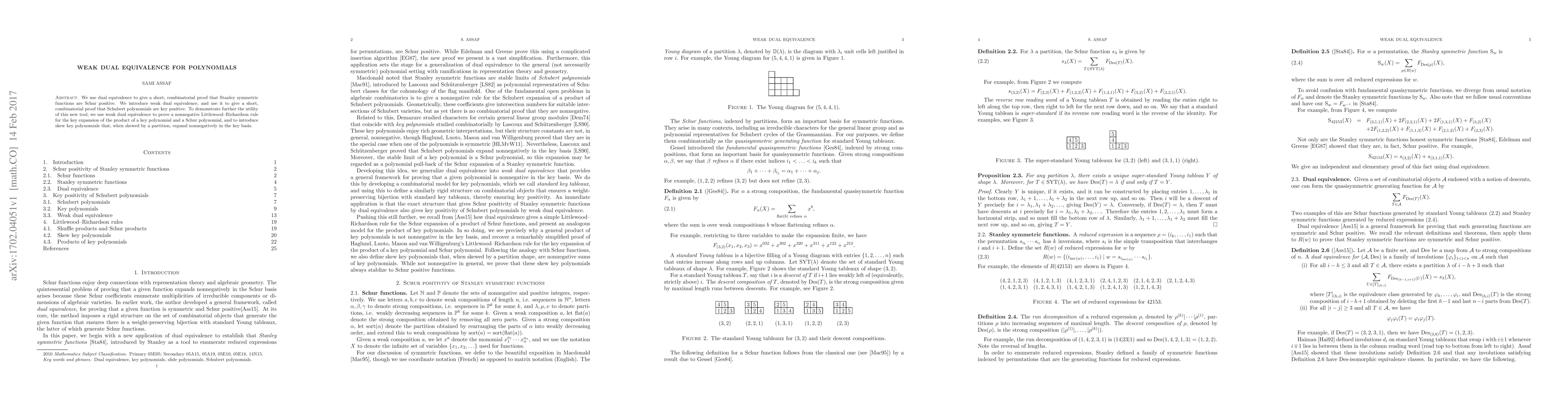 We use dual equivalence to give a short, combinatorial proof that Stanley symmetric functions are Schur positive. We introduce weak dual equivalence, and use it to give a short, combinatorial proof that Schubert polynomials are key positive. To demonstrate further the utility of this new tool, we use weak dual equivalence to prove a nonnegative Littlewood--Richardson rule for the key expansion of the product of a key polynomial and a Schur polynomial, and to introduce skew key polynomials that, when skewed by a partition, expand nonnegatively in the key basis.