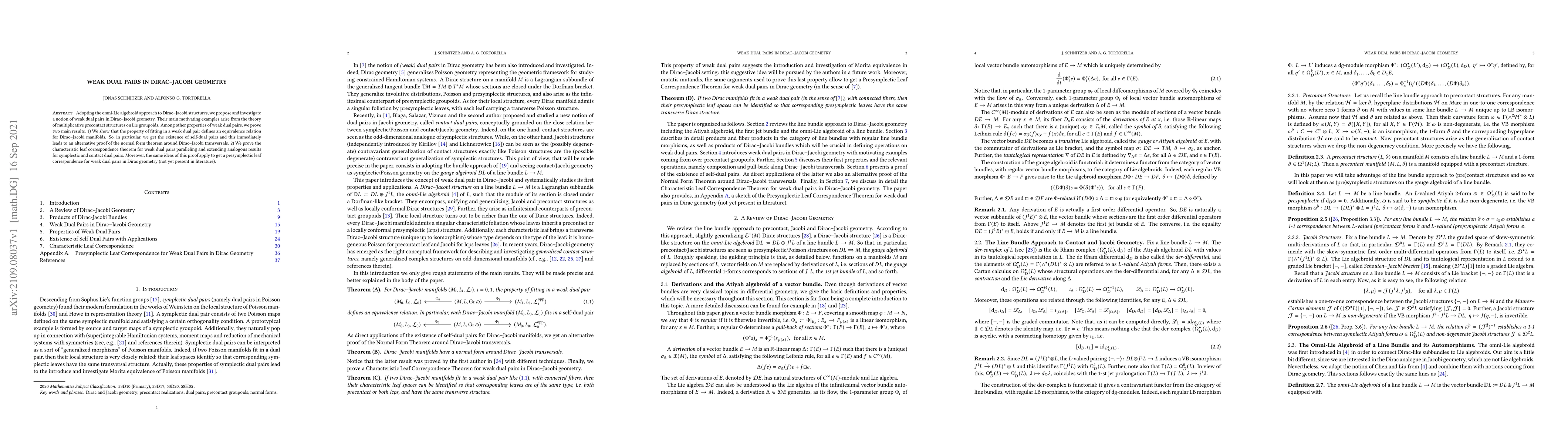 The paper introduces weak dual pairs in Dirac-Jacobi geometry using the omni-Lie algebroid approach and demonstrates their equivalence relation properties, leading to self-dual pairs and an alternative proof of the normal form theorem. It also proves a characteristic leaf correspondence theorem extending similar results for symplectic and contact dual pairs.