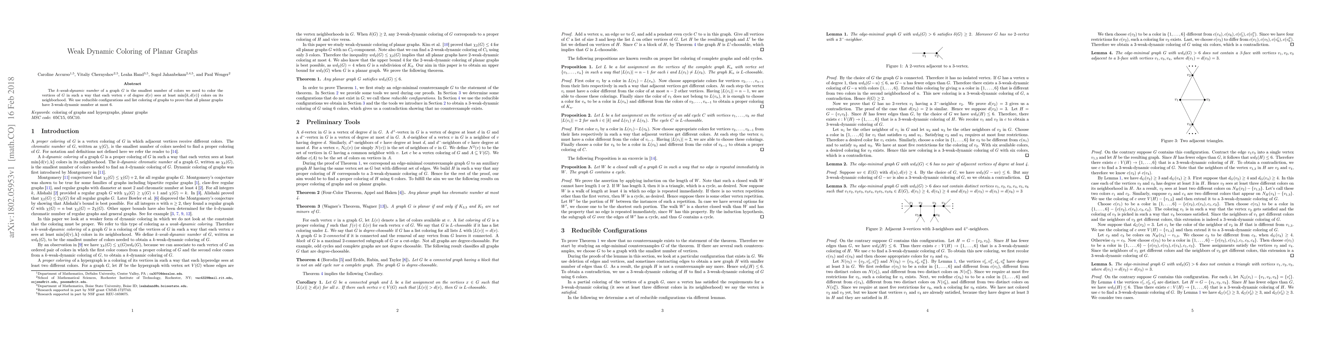This paper demonstrates that planar graphs can be colored using a weak dynamic coloring scheme where each vertex sees at least the minimum of 3 or its own degree colors among its neighbors, with all such graphs requiring no more than 6 colors. The result leverages reducible configurations and list coloring techniques.