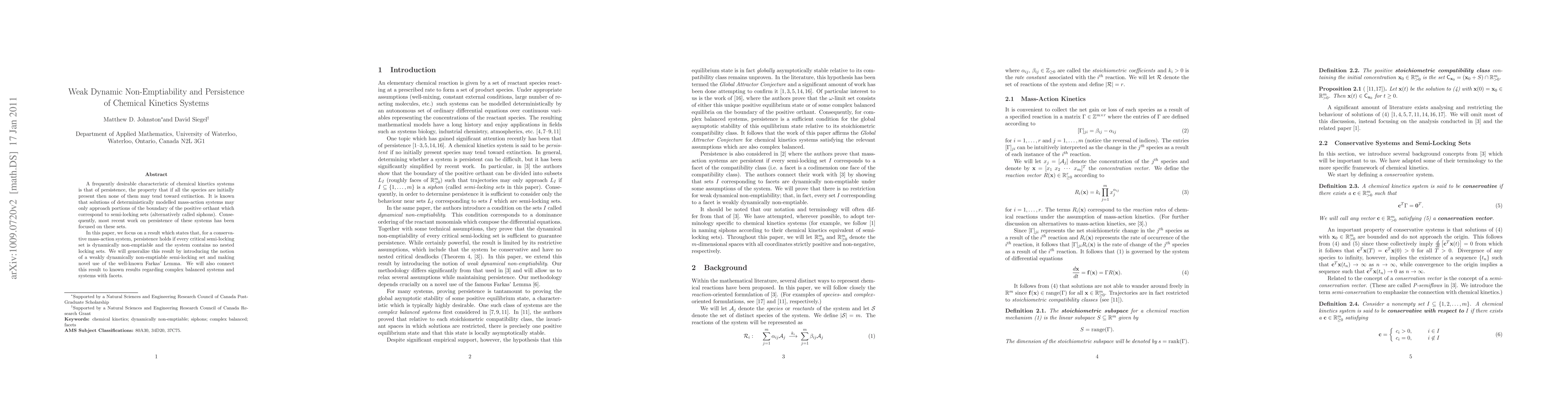 The introduction of weakly dynamically non-emptiable semi-locking sets and the use of Farkas' Lemma to generalize persistence results for mass-action systems.