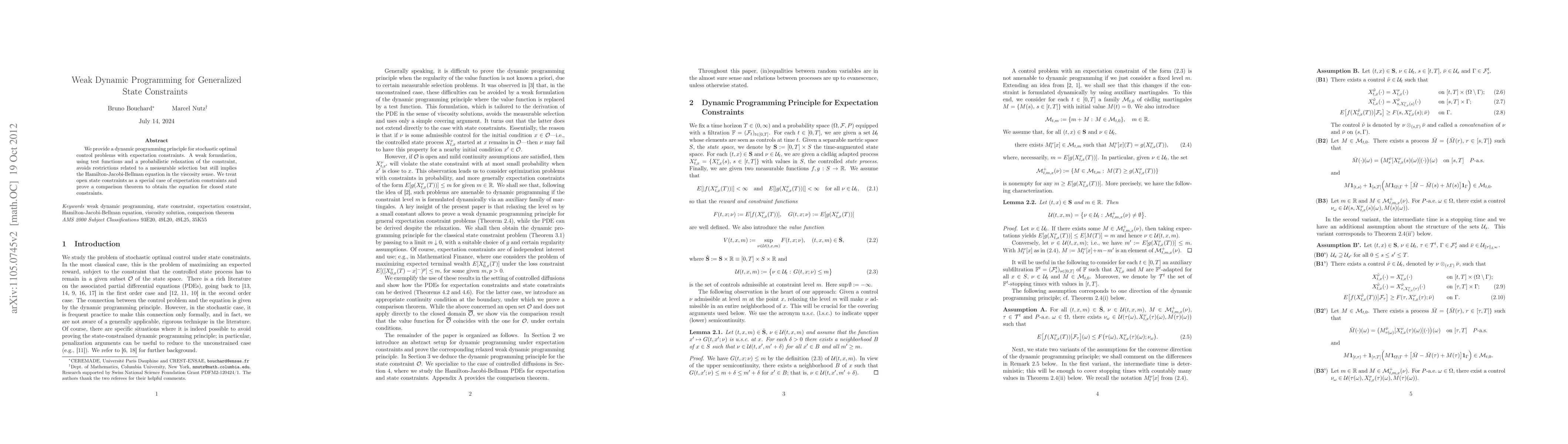 We provide a dynamic programming principle for stochastic optimal control problems with expectation constraints. A weak formulation, using test functions and a probabilistic relaxation of the constraint, avoids restrictions related to a measurable selection but still implies the Hamilton-Jacobi-Bellman equation in the viscosity sense. We treat open state constraints as a special case of expectation constraints and prove a comparison theorem to obtain the equation for closed state constraints.