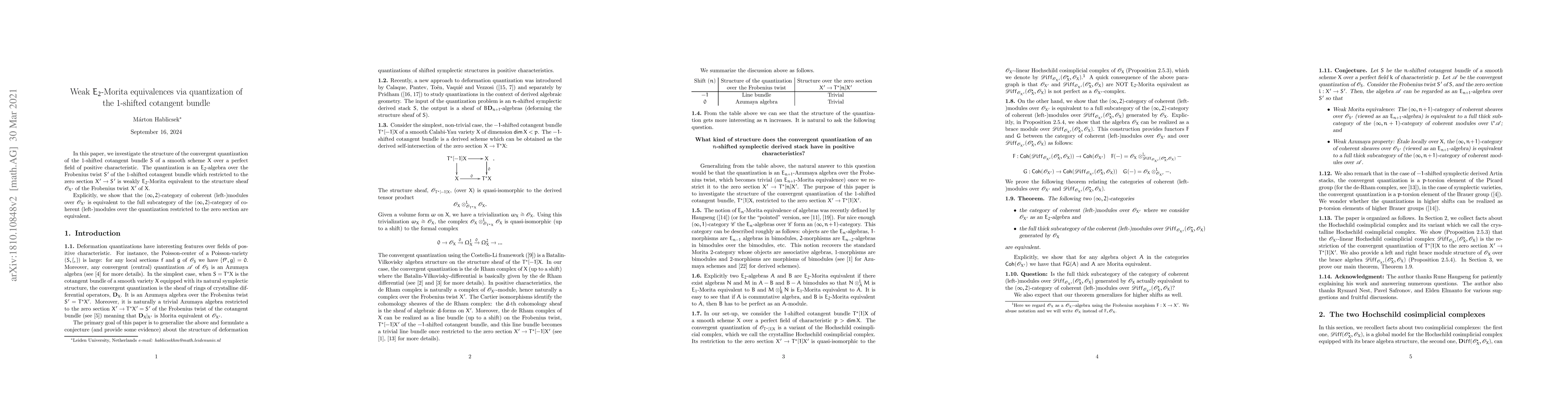 This paper explores the convergent quantization of the 1-shifted cotangent bundle $S$ of a smooth scheme $X$ over a field of positive characteristic, establishing an $E_2$-algebra structure. It shows that this quantization is weakly $E_2$-Morita equivalent to the structure sheaf of the Frobenius twist $X'$, and identifies the $(\infty,2)$-category equivalence between coherent modules over these structures.