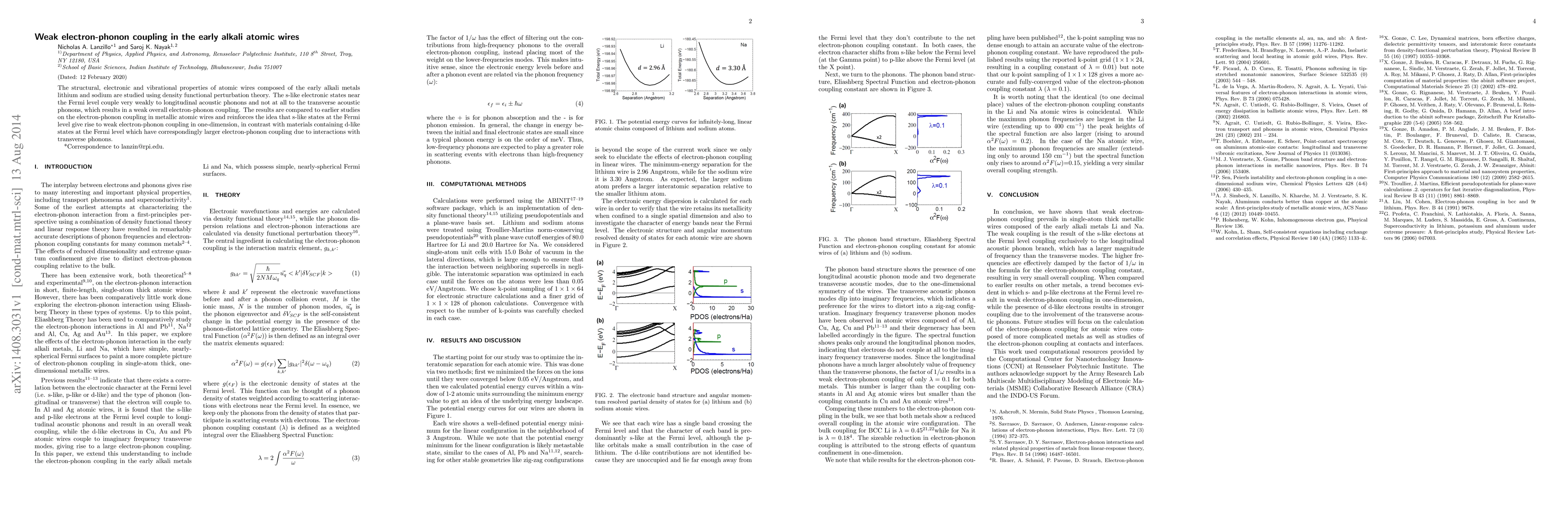 This paper investigates the electron-phonon coupling in lithium and sodium atomic wires using density functional theory, revealing weak coupling due to the s-like electronic states near the Fermi level that do not interact with transverse acoustic phonons. The findings support the notion that s-like states lead to weaker electron-phonon coupling in one-dimensional systems compared to those with d-like states.