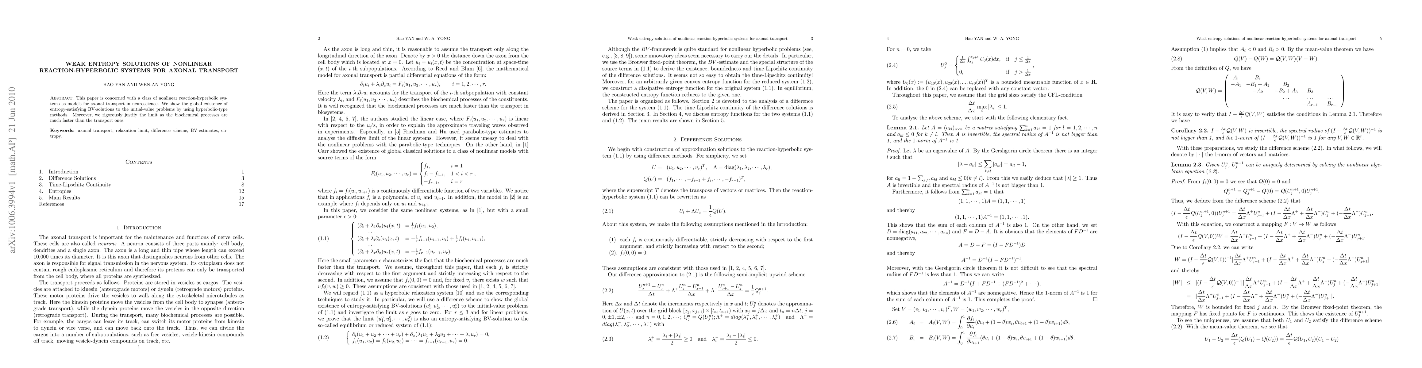This paper establishes the global existence of entropy-satisfying BV-solutions for nonlinear reaction-hyperbolic systems modeling axonal transport, employing hyperbolic-type methods and justifying the limit when biochemical processes are faster than transport processes.