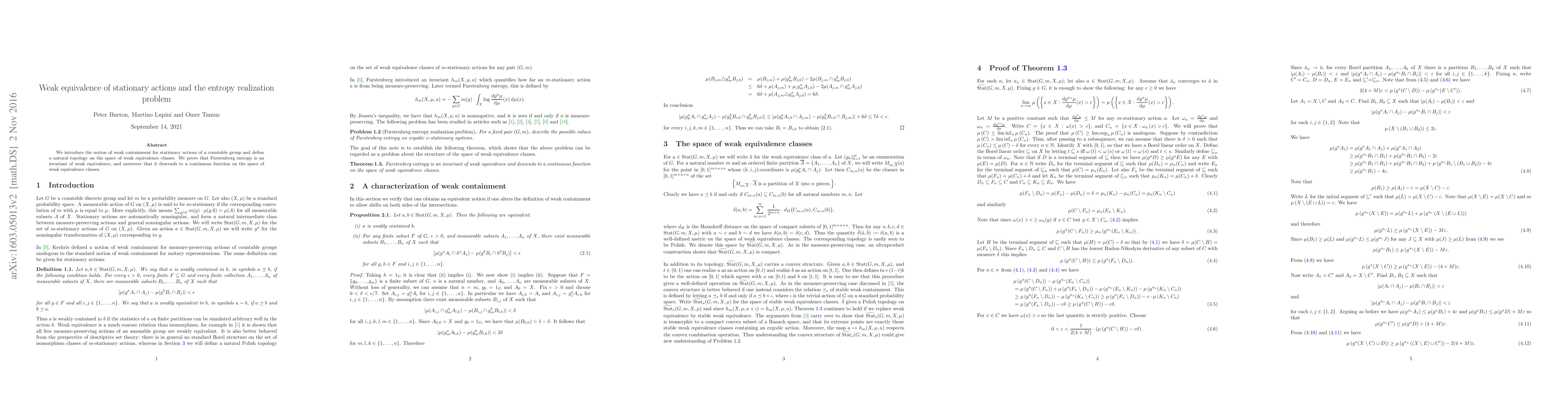 Summary: This paper introduces the concept of weak containment for stationary actions of countable groups and defines a topology on their equivalence classes. It demonstrates that Furstenberg entropy remains invariant under weak equivalence and can be continuously mapped to the space of equivalence classes.