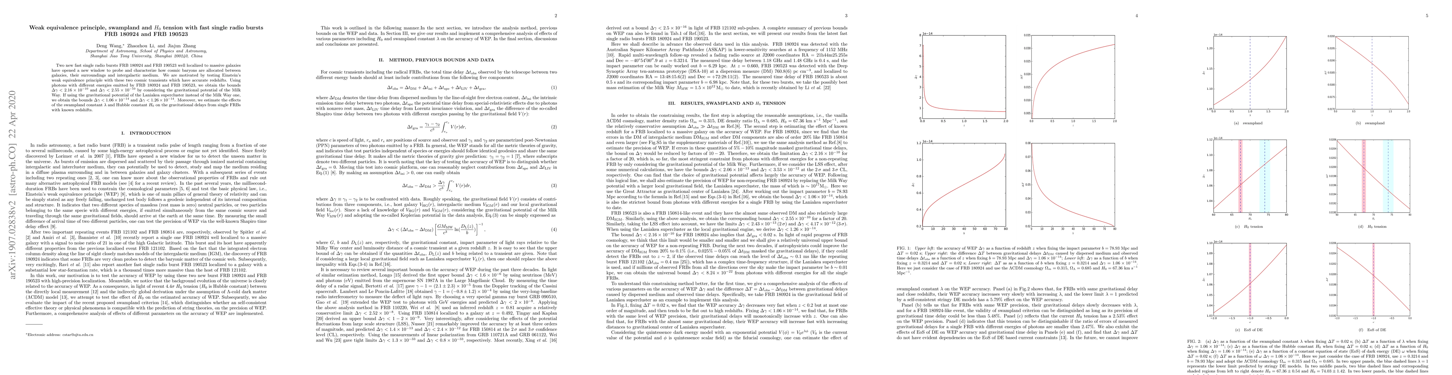 This paper investigates the weak equivalence principle using fast single radio bursts (FRBs) FRB 180924 and FRB 190523, obtaining stringent bounds on the violation of this principle. The study also explores the potential of these FRBs to test the swampland criterion and to determine preferred values of the Hubble constant ($H_0$).