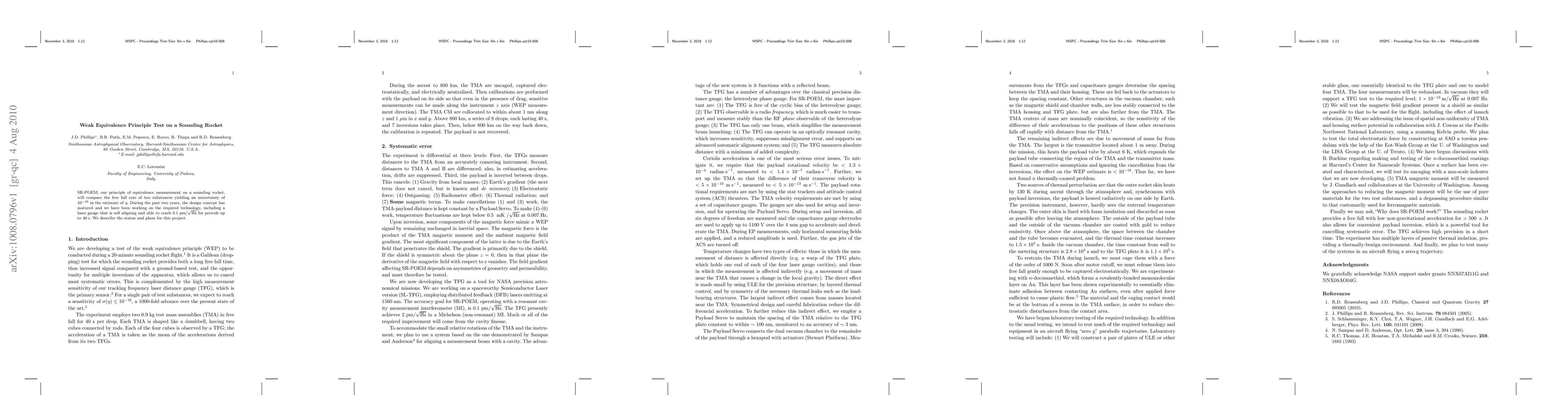 The SR-POEM project aims to test the weak equivalence principle by comparing the free fall rates of two substances with an uncertainty of E-16, utilizing advanced laser gauge technology. The project has developed a self-aligning laser system capable of precision measurements up to 0.1 pm per root hertz for durations up to 40 seconds.