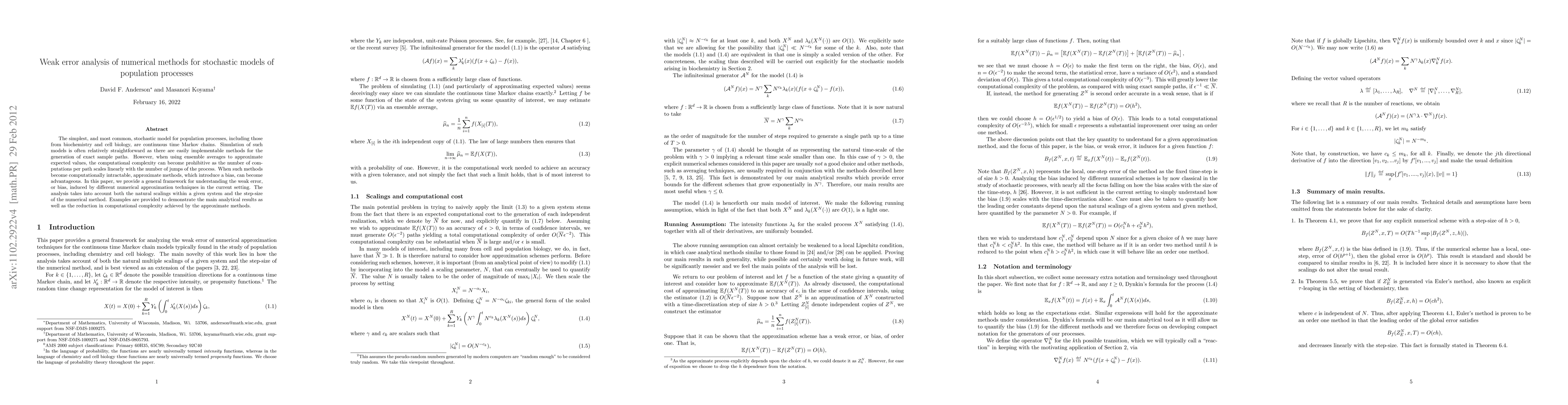 The simplest, and most common, stochastic model for population processes, including those from biochemistry and cell biology, are continuous time Markov chains. Simulation of such models is often relatively straightforward as there are easily implementable methods for the generation of exact sample paths. However, when using ensemble averages to approximate expected values, the computational complexity can become prohibitive as the number of computations per path scales linearly with the number of jumps of the process. When such methods become computationally intractable, approximate methods, which introduce a bias, can become advantageous. In this paper, we provide a general framework for understanding the weak error, or bias, induced by different numerical approximation techniques in the current setting. The analysis takes into account both the natural scalings within a given system and the step-size of the numerical method. Examples are provided to demonstrate the main analytical results as well as the reduction in computational complexity achieved by the approximate methods.