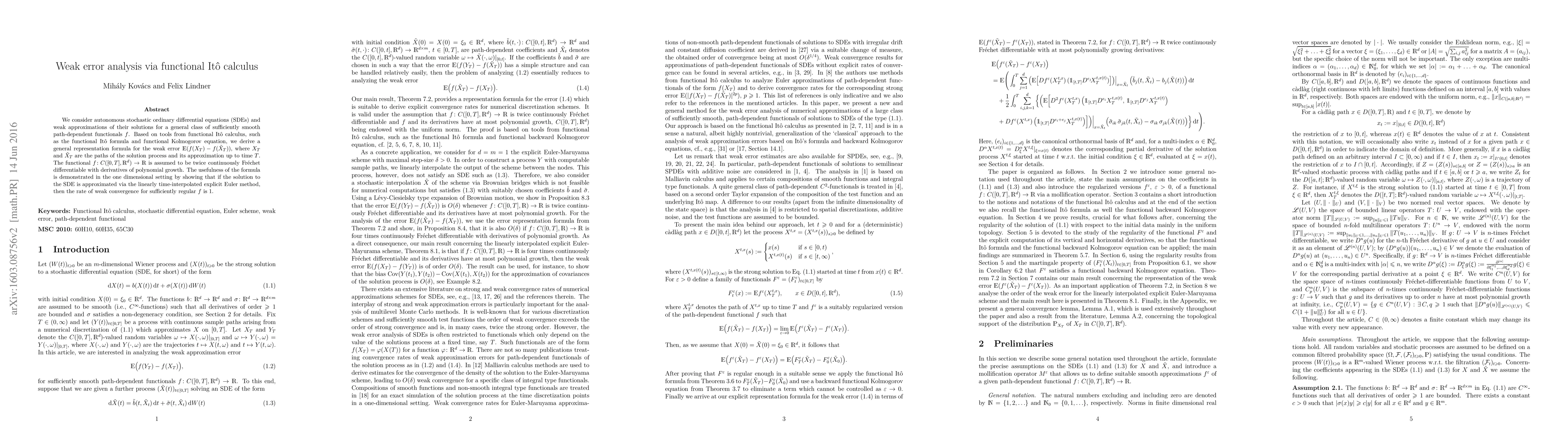 This paper develops a general representation formula for the weak error in approximating solutions of stochastic ordinary differential equations using functional Itô calculus. It demonstrates the formula's utility in one dimension, showing that linear time-interpolation of the explicit Euler method achieves a weak convergence rate of 1 for sufficiently smooth functionals.