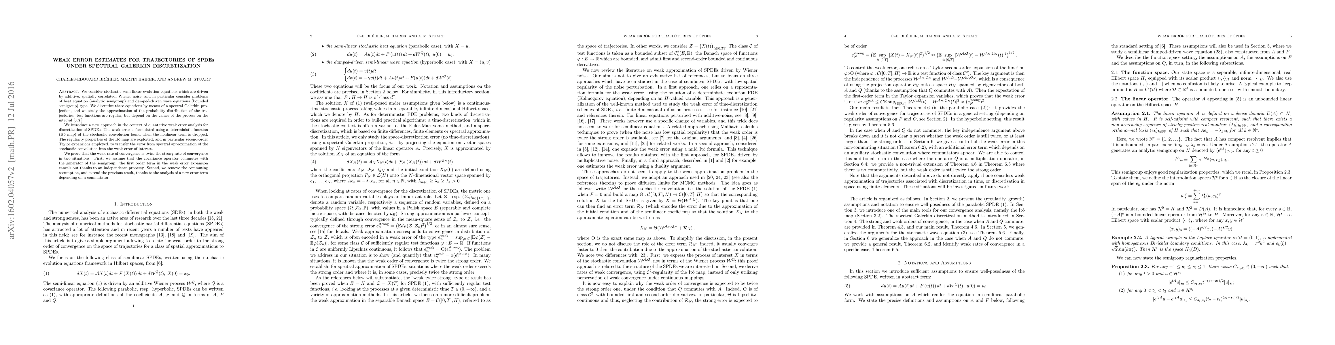 We consider stochastic semi-linear evolution equations which are driven by additive, spatially correlated, Wiener noise, and in particular consider problems of heat equation (analytic semigroup) and damped-driven wave equations (bounded semigroup) type. We discretize these equations by means of a spectral Galerkin projection, and we study the approximation of the probability distribution of the trajectories: test functions are regular, but depend on the values of the process on the interval $[0,T]$. We introduce a new approach in the context of quantative weak error analysis for discretization of SPDEs. The weak error is formulated using a deterministic function (It\^o map) of the stochastic convolution found when the nonlinear term is dropped. The regularity properties of the It\^o map are exploited, and in particular second-order Taylor expansions employed, to transfer the error from spectral approximation of the stochastic convolution into the weak error of interest. We prove that the weak rate of convergence is twice the strong rate of convergence in two situations. First, we assume that the covariance operator commutes with the generator of the semigroup: the first order term in the weak error expansion cancels out thanks to an independence property. Second, we remove the commuting assumption, and extend the previous result, thanks to the analysis of a new error term depending on a commutator.