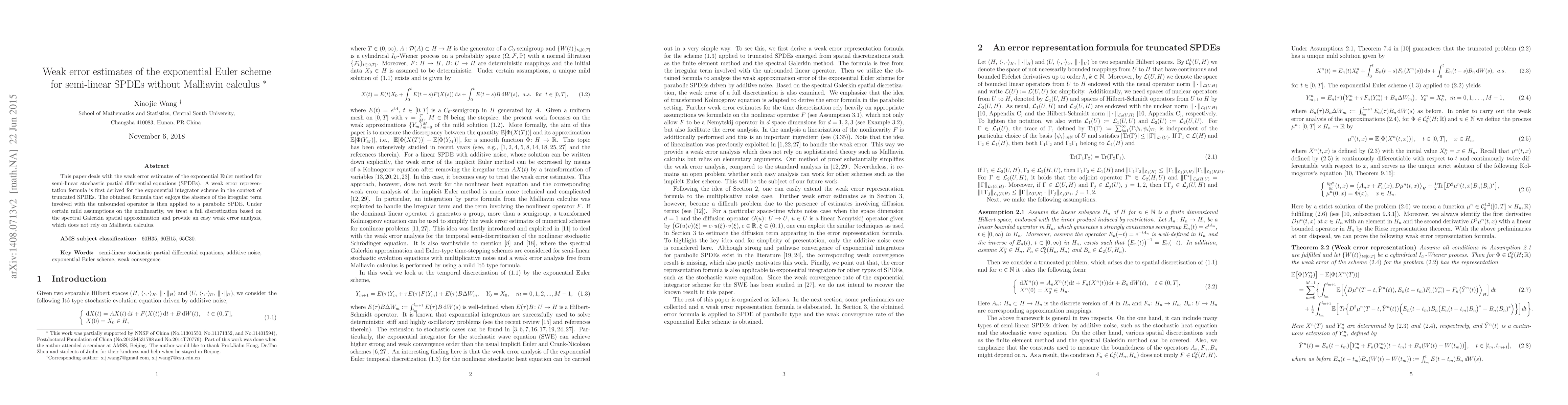 This paper derives weak error estimates for the exponential Euler method applied to semi-linear stochastic partial differential equations (SPDEs) without using Malliavin calculus. It provides a weak error representation formula for truncated SPDEs and applies it to a parabolic SPDE, achieving a full discretization with an easy weak error analysis.