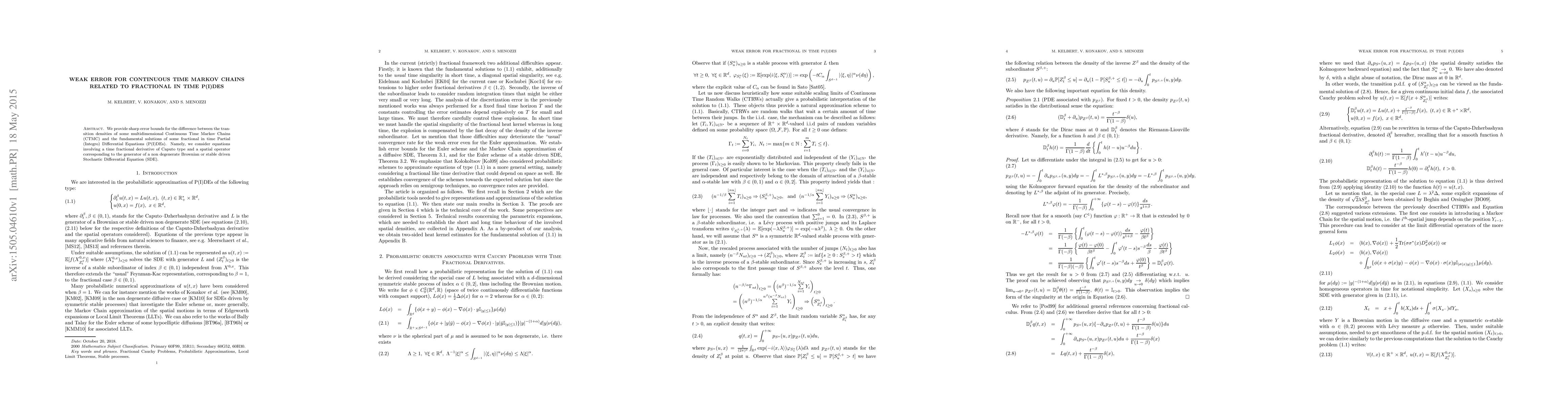 We provide sharp error bounds for the difference between the transition densities of some multidimensional Continuous Time Markov Chains (CTMC) and the fundamental solutions of some fractional in time Partial (Integro) Differential Equations (P(I)DEs). Namely, we consider equations involving a time fractional derivative of Caputo type and a spatial operator corresponding to the generator of a non degenerate Brownian or stable driven Stochastic Differential Equation (SDE).