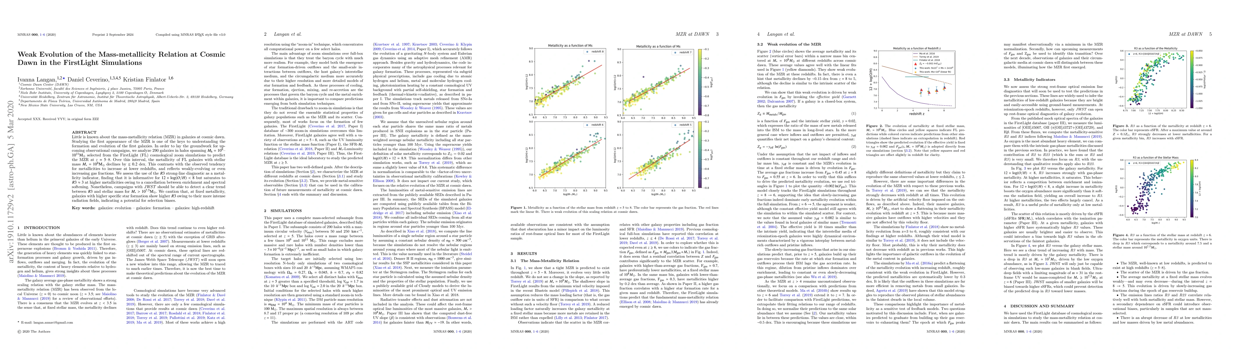 This paper examines the mass-metallicity relation (MZR) in galaxies at cosmic dawn using the FirstLight cosmological simulations, finding little evolution in metallicity over stellar masses at z=5-8. The study highlights the potential for JWST to detect trends in metallicity indicators despite saturation issues at higher metallicities.