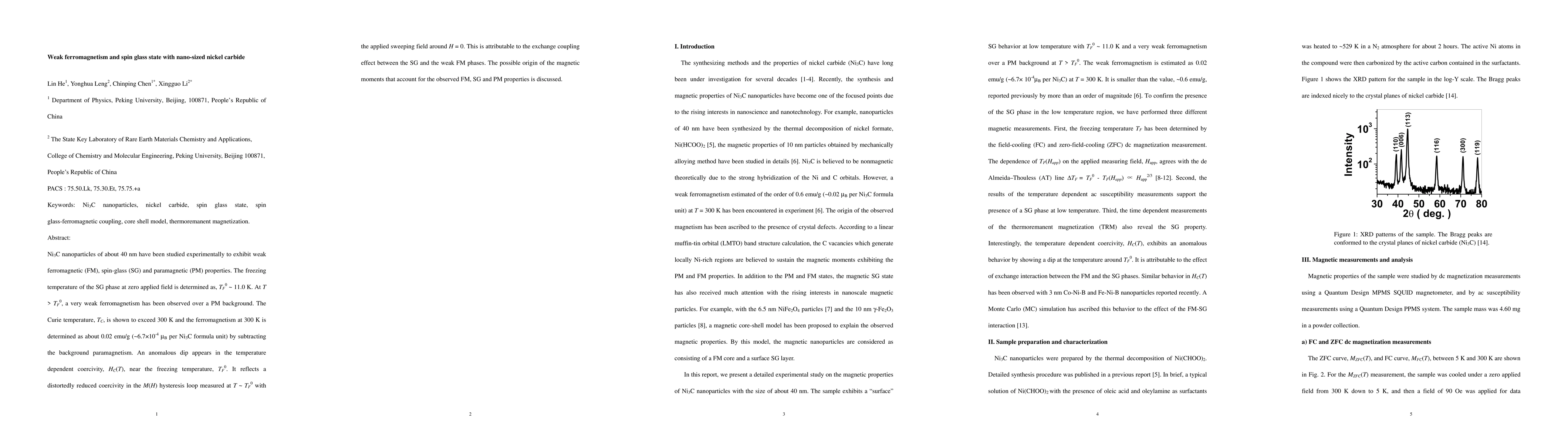 Ni3C nanoparticles of about 40 nm have been studied experimentally to exhibit weak ferromagnetic (FM), spin-glass (SG) and paramagnetic (PM) properties. The freezing temperature of the SG phase at zero applied field is determined as, TF0 ~ 11.0 K. At T > TF0, a very weak ferromagnetism has been observed over a PM background. The Curie temperature, TC, is shown to exceed 300 K and the ferromagnetism at 300 K is determined as about 0.02 emu/g (~6.7*10^{-4}mu_B per Ni3C formula unit) by subtracting the background paramagnetism. An anomalous dip appears in the temperature dependent coercivity, HC(T), near the freezing temperature, TF0. It reflects a distortedly reduced coercivity in the M(H) hysteresis loop measured at T = TF0 with the applied sweeping field around H = 0. This is attributable to the exchange coupling effect between the SG and the weak FM phases. The possible origin of the magnetic moments that account for the observed FM, SG and PM properties is discussed.