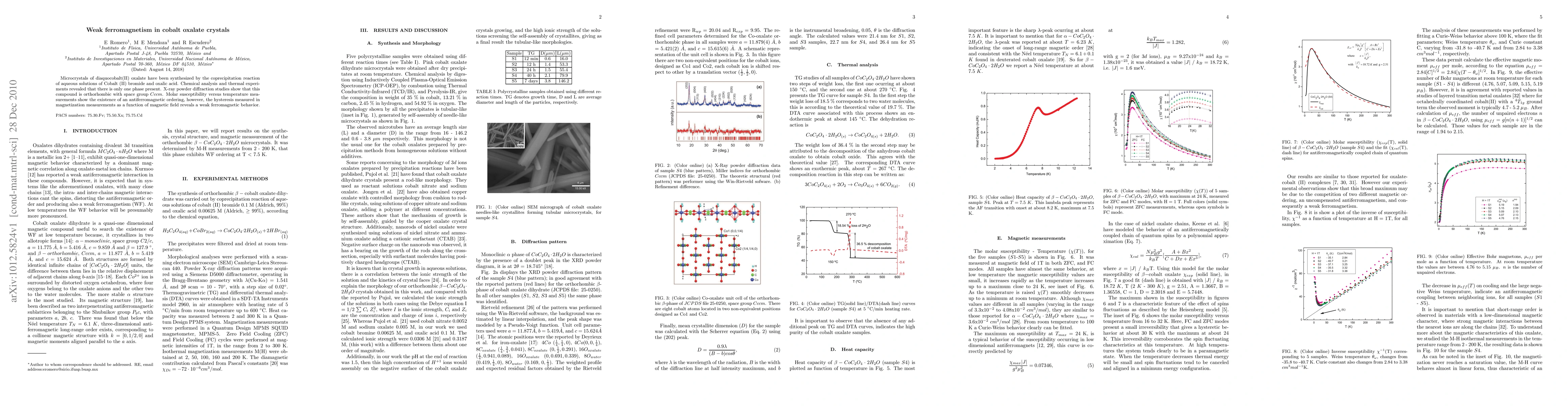 Microcrystals of diaquocobalt(II) oxalate have been synthesized by the coprecipitation reaction of aqueous solutions of Cobalt (II) bromide and oxalic acid. Chemical analysis and thermal experiments revealed that there is only one phase present. X-ray powder diffraction studies show that this compound is orthorhombic with space group Cccm. Molar susceptibility versus temperature measurements show the existence of an antiferromagnetic ordering, however, the hysteresis measured in magnetization measurements as a function of magnetic field reveals a weak ferromagnetic behavior.