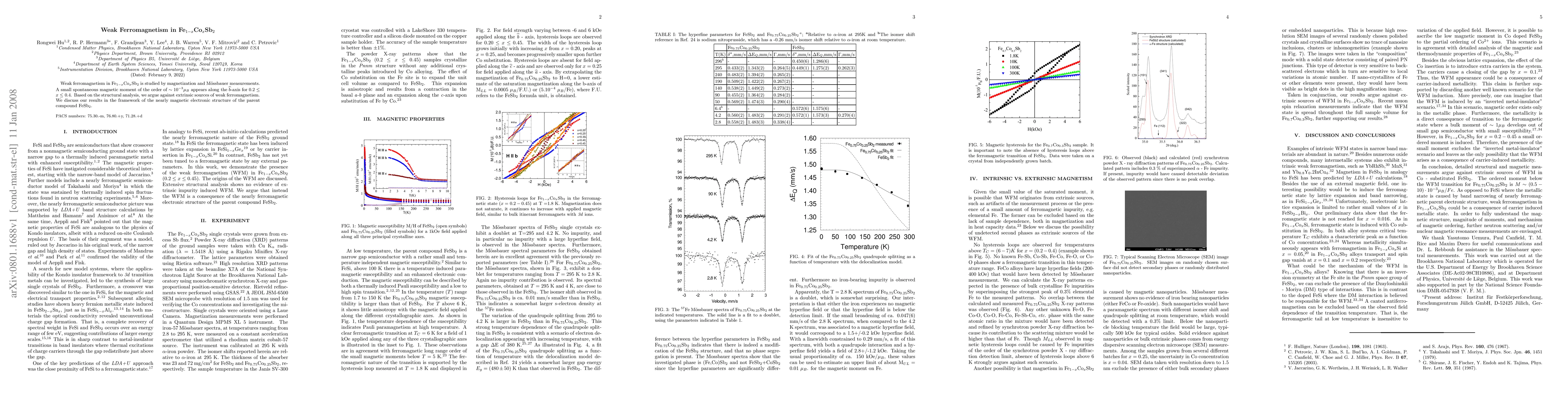 Research on Fe1-xCoxSb2 reveals weak ferromagnetism in a narrow range of x values (0.2 to 0.4), with a small spontaneous magnetic moment along the b-axis.