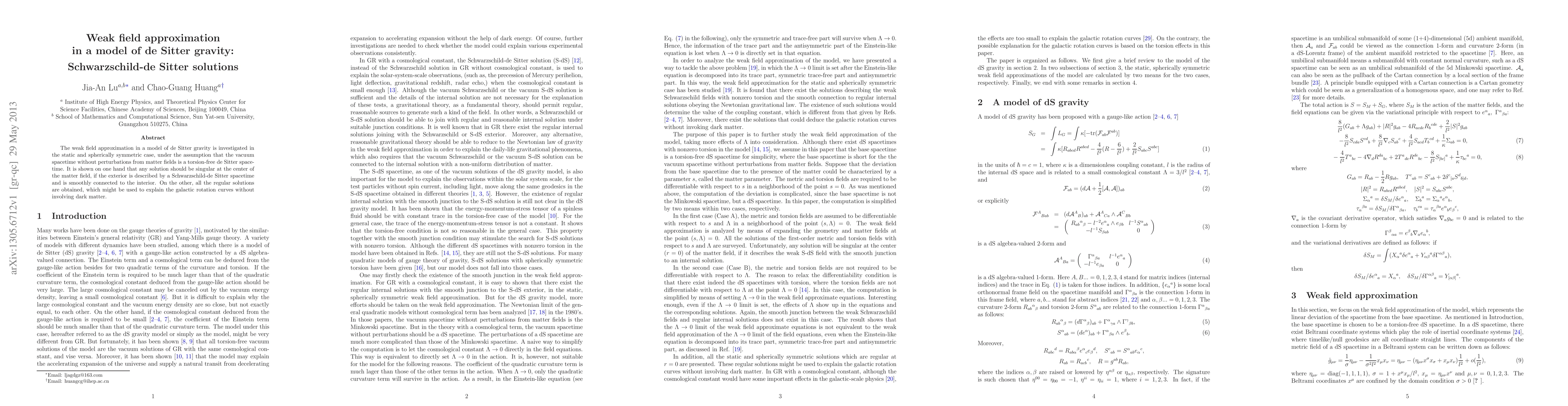 Summary: This paper explores the weak field approximation in de Sitter gravity, revealing that any static, spherically symmetric solution must be singular at the center if it connects to a Schwarzschild-de Sitter exterior. It also identifies regular solutions that could potentially explain galactic rotation curves without invoking dark matter.